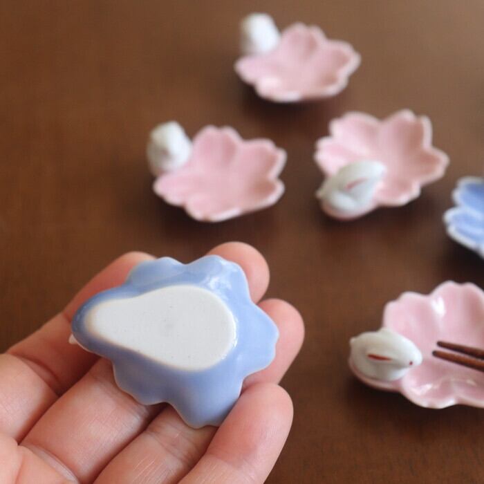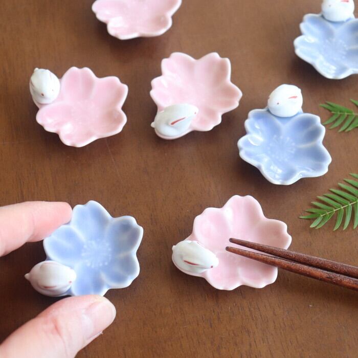 さくらの花と白いうさぎのコンビがかわいらしい波佐見焼のの箸置き。淡いパステルカラーのピンクと青のさくらが和やかな色合いで、白い兎との相性もぴったり。食卓が華やかな雰囲気になります♪ 箸置きとしてはもちろん、お塩やわさびをのせて豆皿としてもアクセントになりそうです。