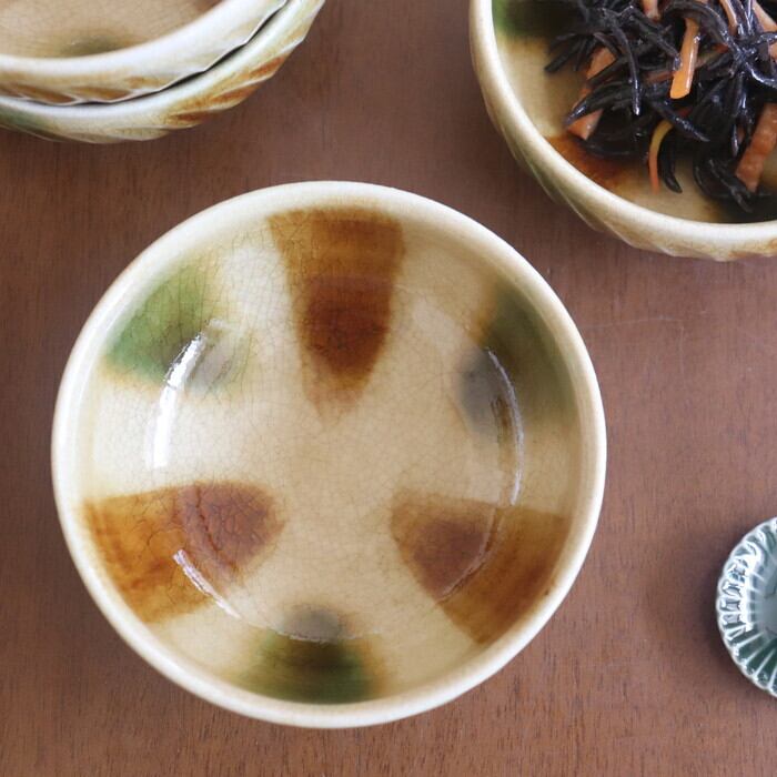 ザ・小鉢といった形・大きさの瀬戸赤津焼(愛知)の小鉢。ひじき煮や冷や奴、ほうれん草のごま和えなどにぴったりのサイズ感です。果物やヨーグルト、アイスクリームなどにも使いやすそう。赤や白、緑といったビビッドなカラーが映えそうな落ち着いた色合いです。