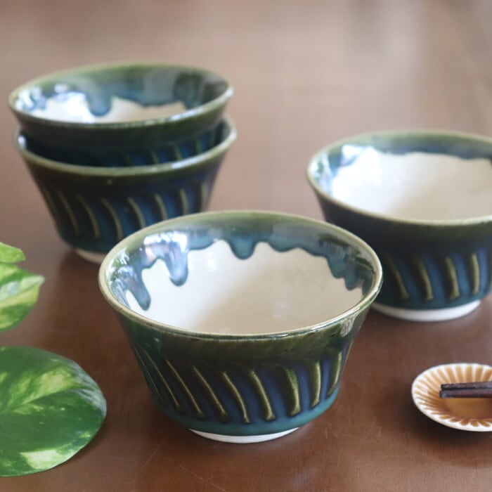 小鉢の外側と内側上部に深い緑が美しい織部(おりべ)釉が施され、落ち着いた雰囲気に。外側に施された波のような彫の文様も上品でおしゃれ。パイナップルやスイカなどのカラフルなカットフルーツとも相性が良さそうです♬