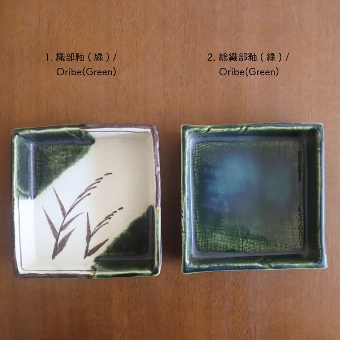 深い緑が美しい織部(おりべ)釉、透明感のある淡い青磁色が爽やかな御深井(おふけ)釉、落ち着いたからし色の黄瀬戸(きぜと)釉。それぞれに魅力的です♬