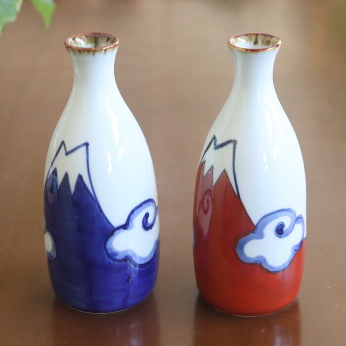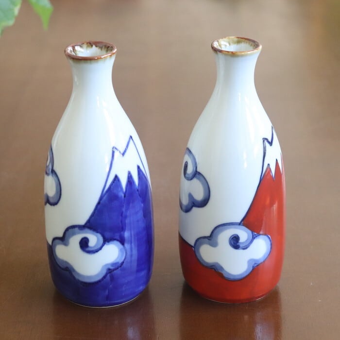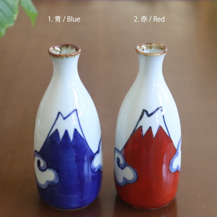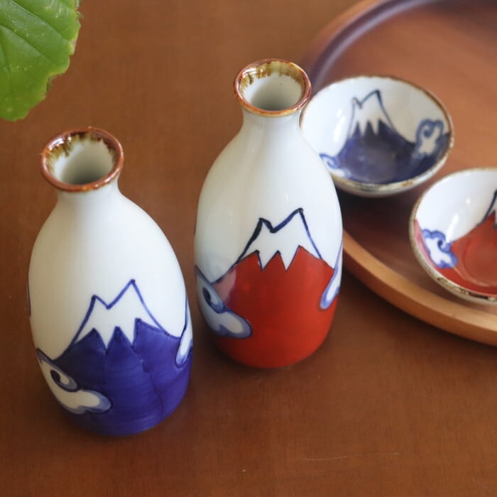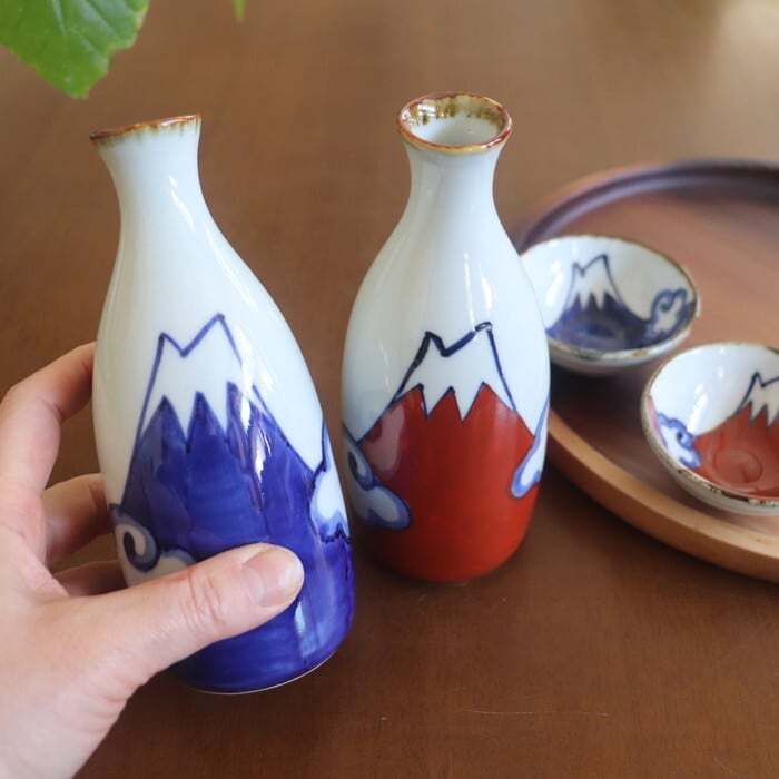 日本の象徴・富士山をモチーフにした、どこか懐かしいシェイプの徳利。青と赤で力強く描かれた富士山の絵柄は、一つひとつ職人さんの手によるもの。同シリーズの盃とセットで使うと、統一感があって気分が盛り上がります♪ 山好き、日本酒好きの方へのギフトとしても、喜ばれそう★