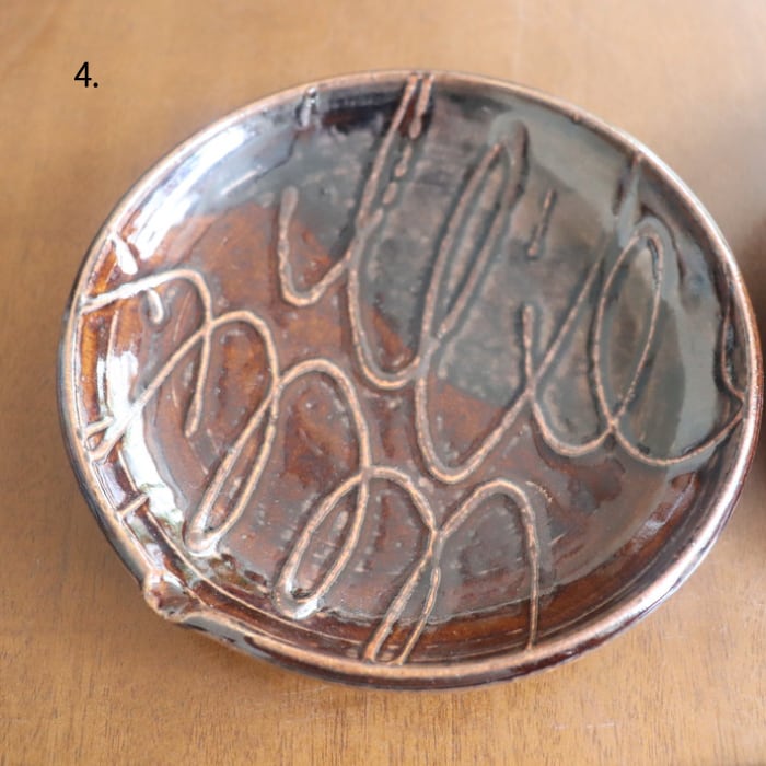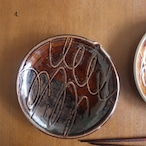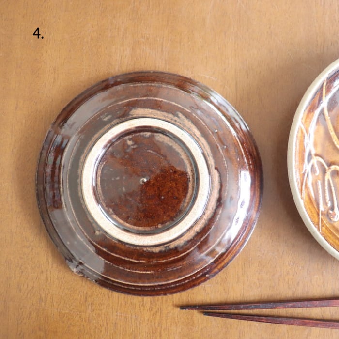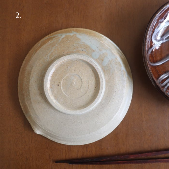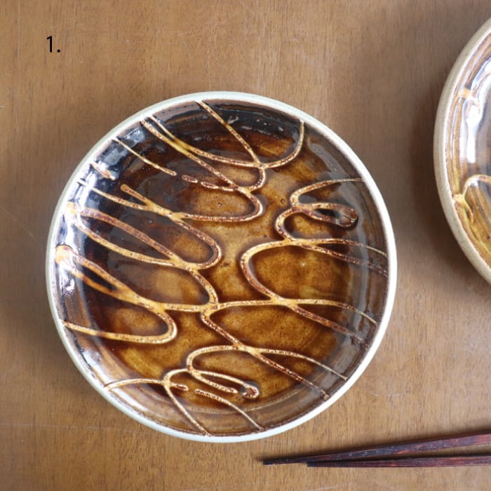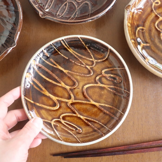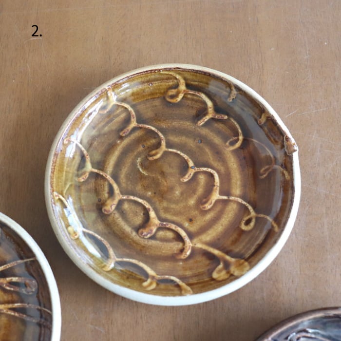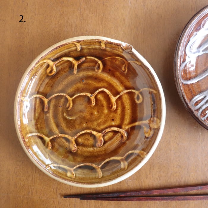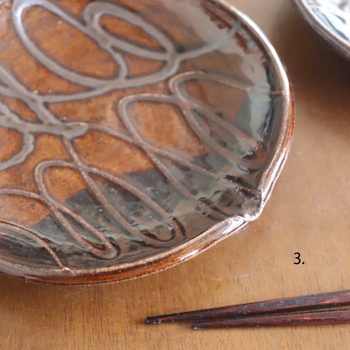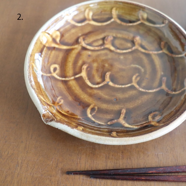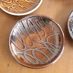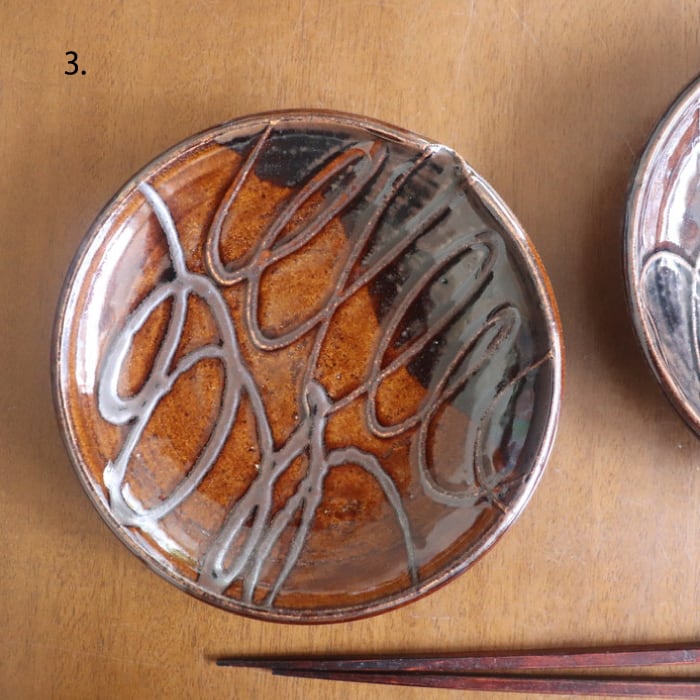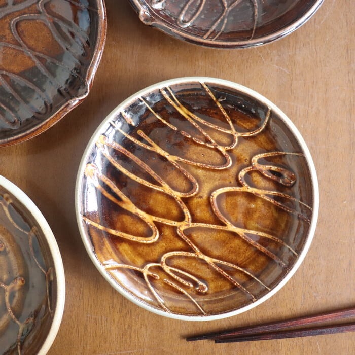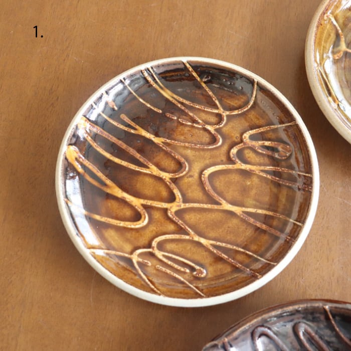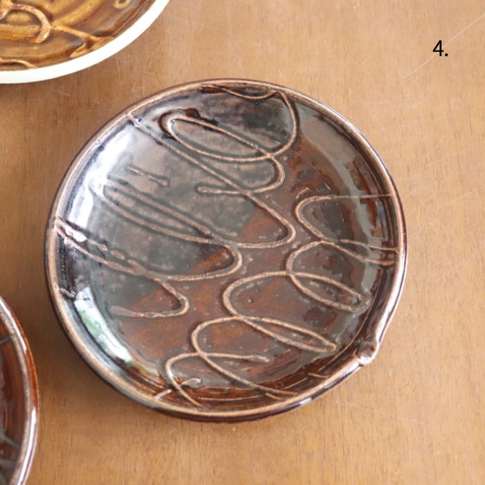 いっちんで賑やかな装飾が施された益子焼(栃木県)の丸皿。ややフラットな形状で、程よい厚みが掴みやすく、取り皿にぴったりのサイズ感。2~4のお皿には、片口のような「口」がついていますが、作り手の榎田 智さん曰く「遊び心!」だそうで、特に何か特別な用途のためのものではないそうです。といった、仕掛けも楽しく、食卓の会話が弾みそうです♬