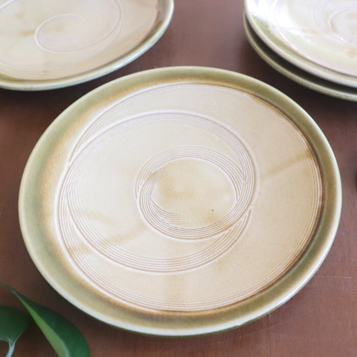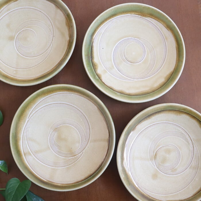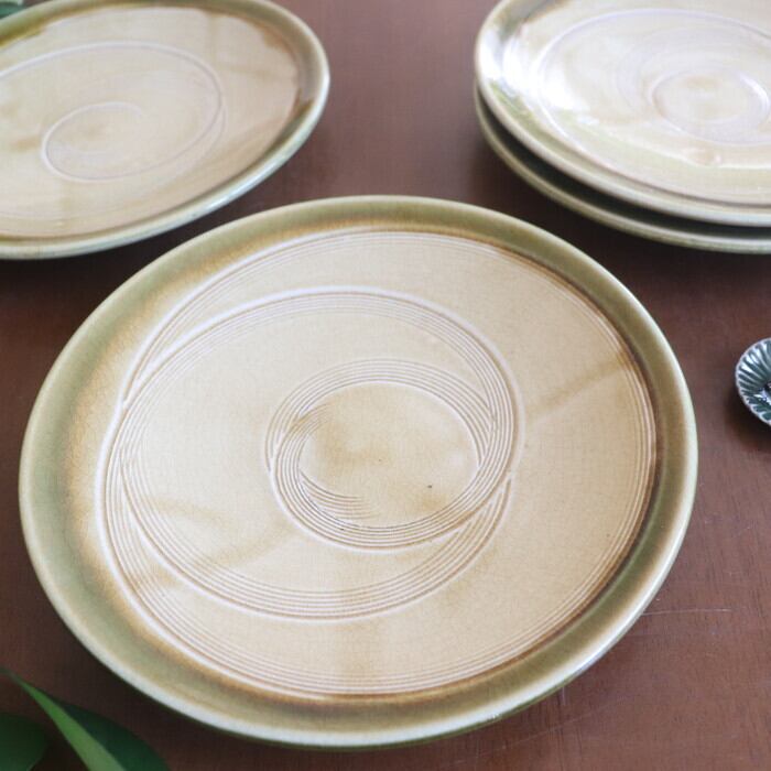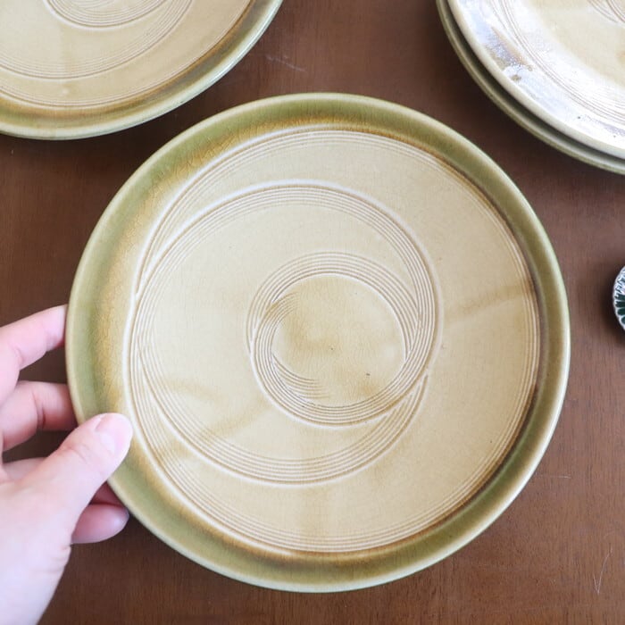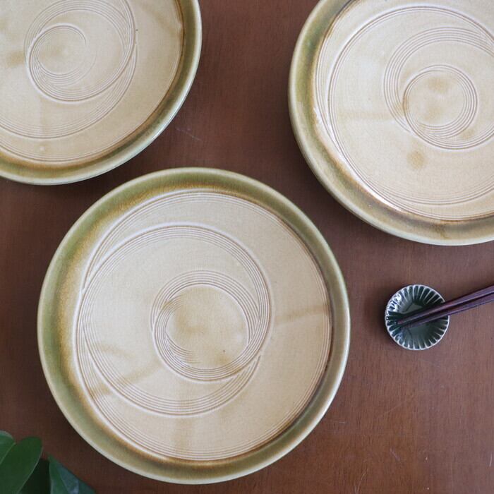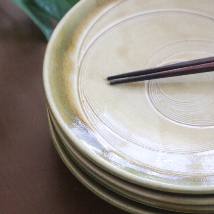 黄瀬戸の落ち着いた色合いと櫛目の遊び心のあるデザインが素敵な瀬戸赤津焼(愛知)の6寸皿。薄くて浅い(フラットぎみ)形状で、1品料理のおかず皿に使いやすいサイズ感です。和食はもちろん、生春巻きやパクチーサラダなど、アジアンテイストな料理とも相性が良さそう♬
