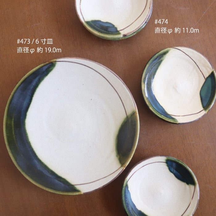 深緑が美しい織部釉を両サイドに配したデザインの瀬戸赤津焼(愛知)の6寸皿。薄くて浅い(フラットぎみ)形状なので、炒め物や揚げ物といった日々のおかず皿に使いやすそうです。