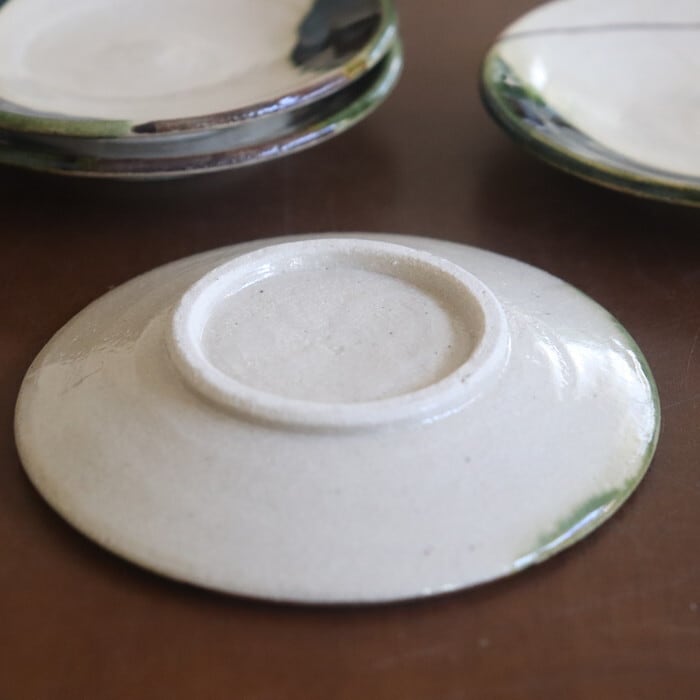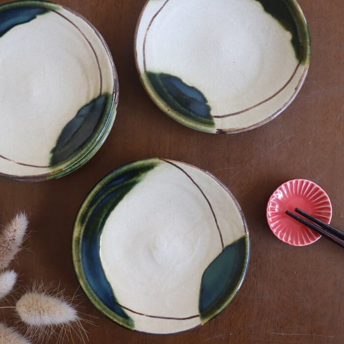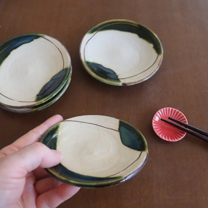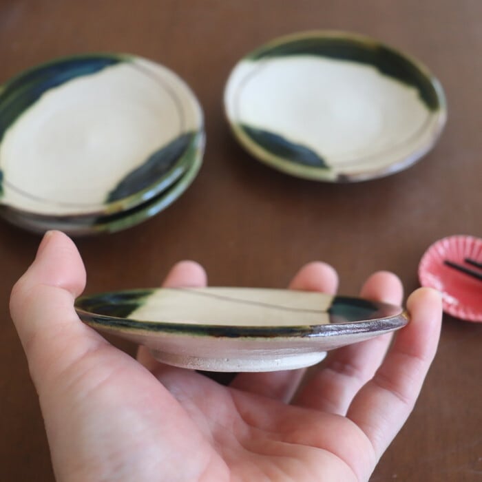 深緑が美しい織部釉を両サイドに配したデザインの瀬戸赤津焼(愛知)の小皿。フラット気味な形状ですが、お寿司やお刺身の際のお醤油皿としも使える程度のためはあります。大福などの和菓子やくし切りにしたリンゴ2切れくらいを乗せるのにちょうど良いサイズです。同デザインの6寸皿とセットで使ってもきちんと感があって素敵です♪