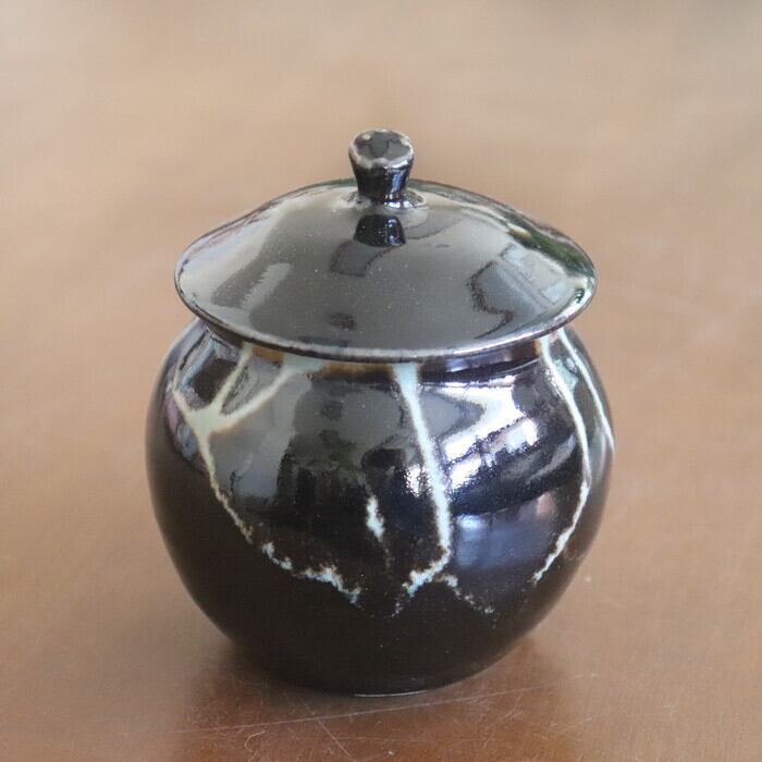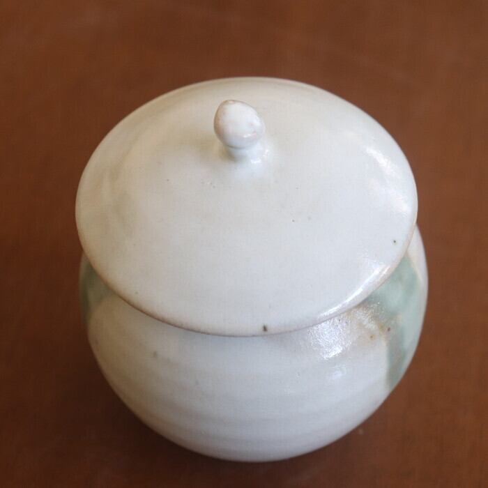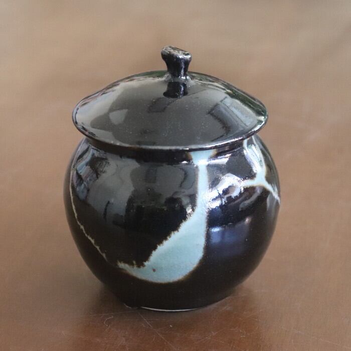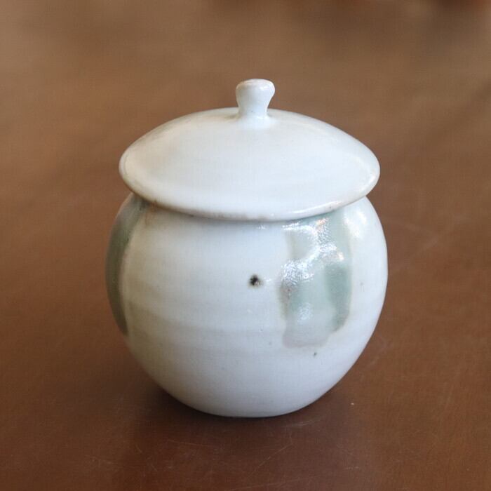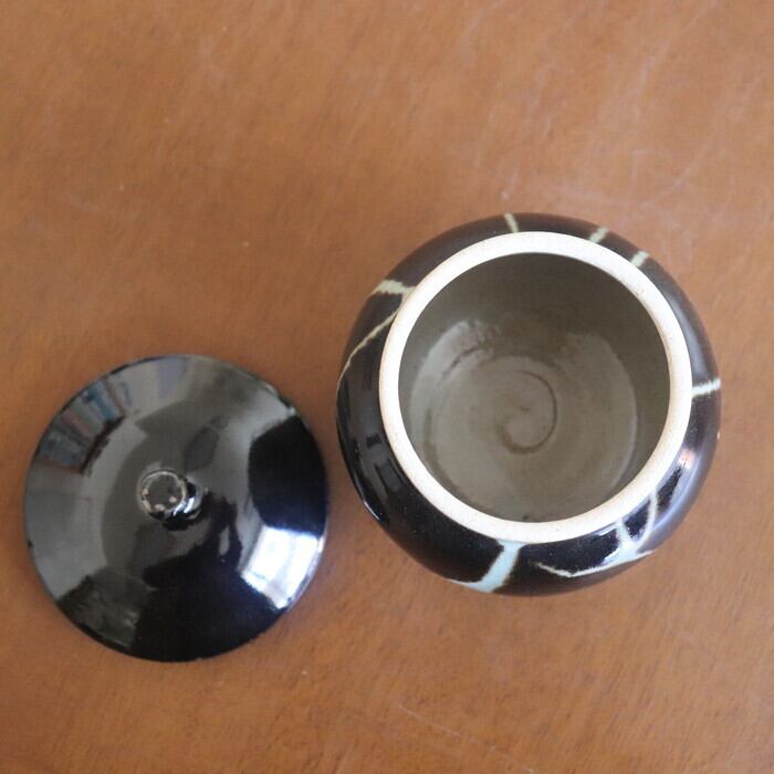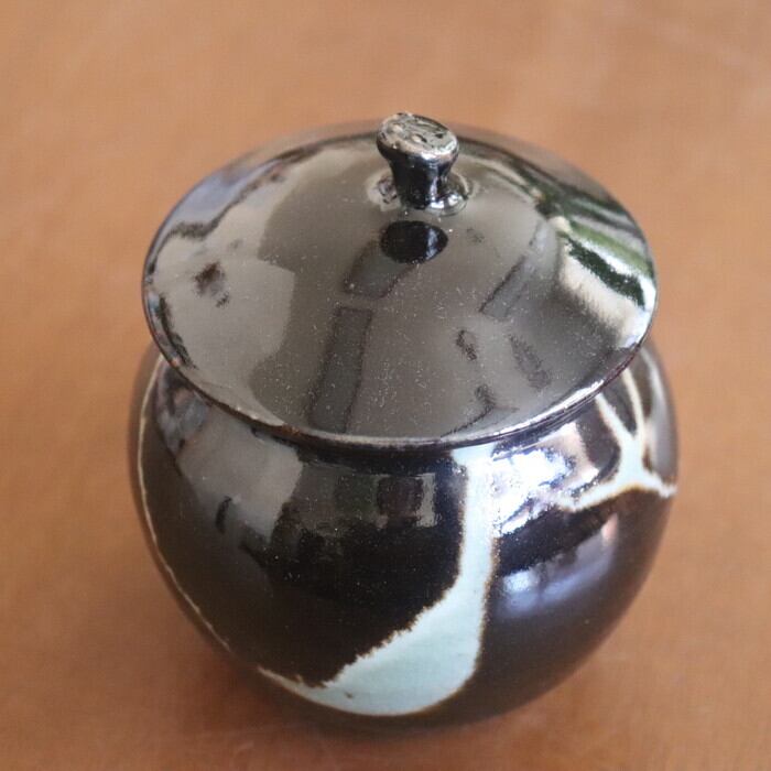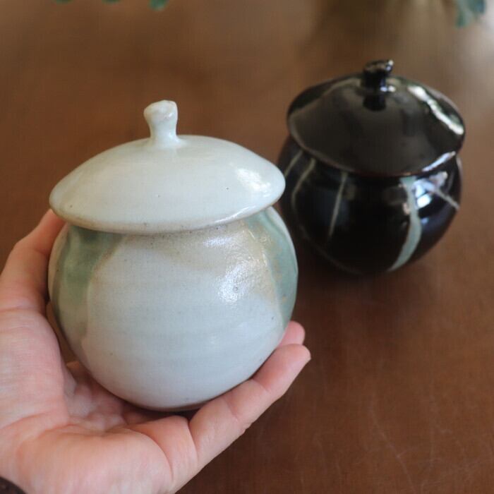 どこか懐かしいデザインの益子焼(栃木県)の蓋もの(蓋つきの器)。梅干しを入れるのにぴったり♬ 蓋のつまみが微妙に細長くてつかみやすいのも嬉しいポイントです。在宅ワークの方は、飴やチョコレートを入れてデスクまわりにもどうぞ★