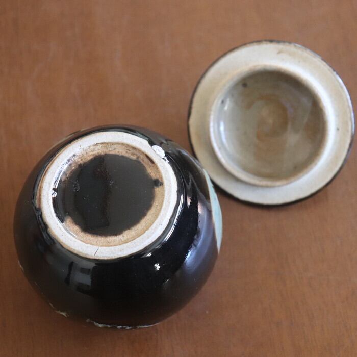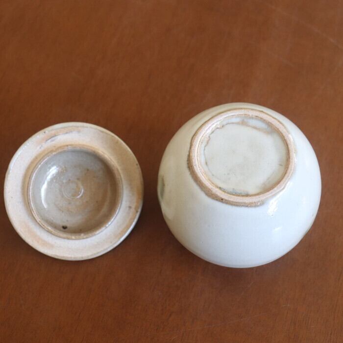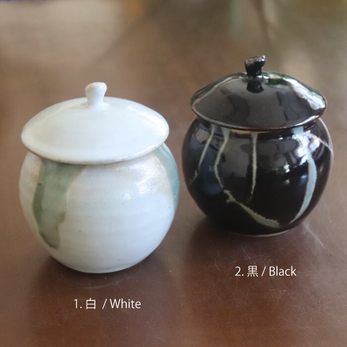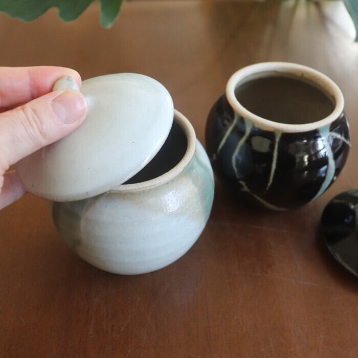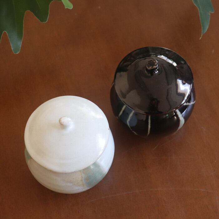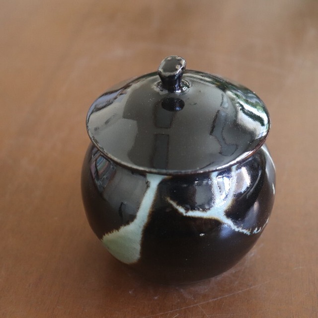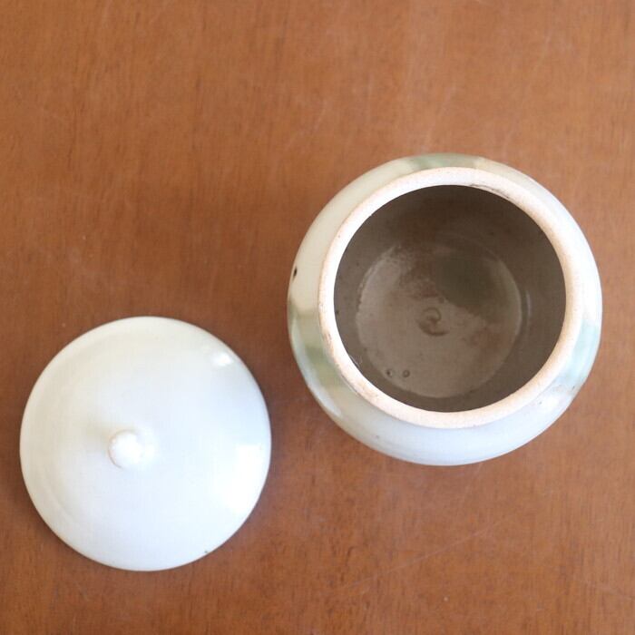 どこか懐かしいデザインの益子焼(栃木県)の蓋もの(蓋つきの器)。梅干しを入れるのにぴったり♬ 蓋のつまみが微妙に細長くてつかみやすいのも嬉しいポイントです。在宅ワークの方は、飴やチョコレートを入れてデスクまわりにもどうぞ★