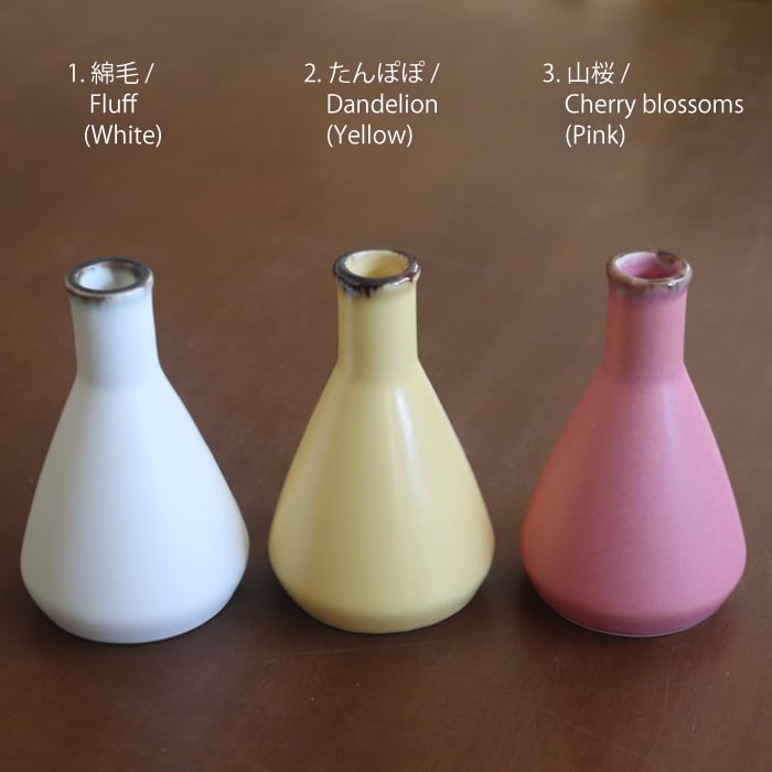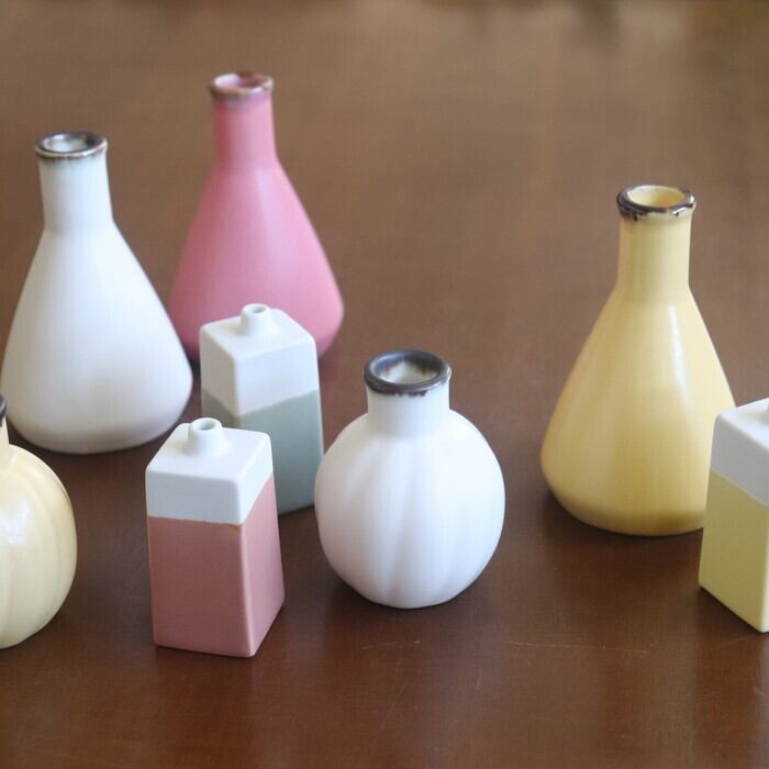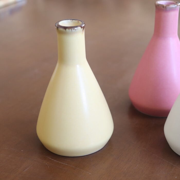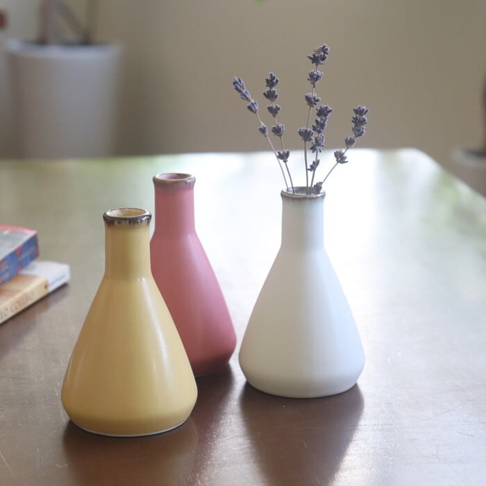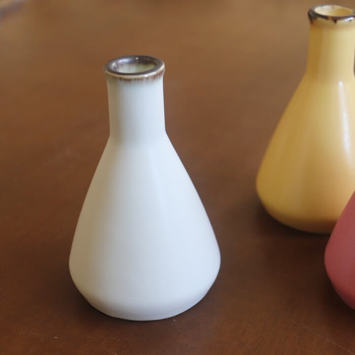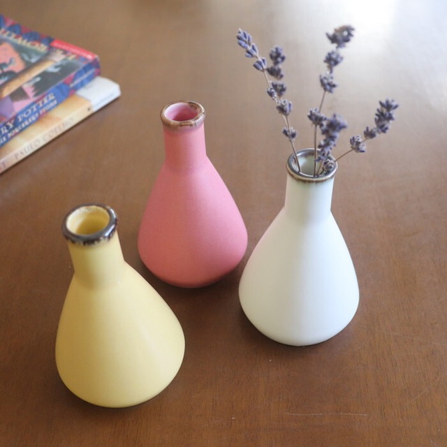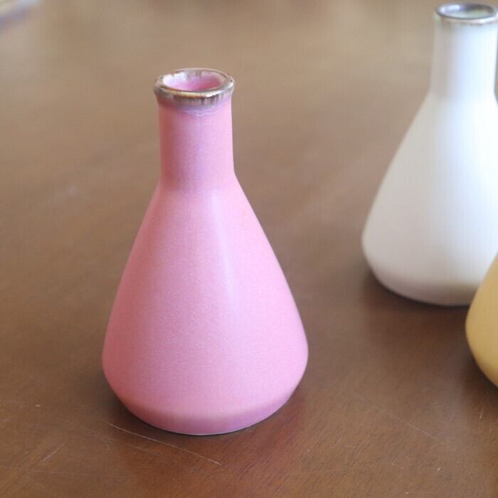 フラスコのようなフォルムが特徴的な波佐見焼(長崎県)の花入れ。落ち着いたマットな色合いとマッチしてふんわりした印象に。カーネーションやマーガレットのような生花はもちろん、ドライフラワーとも相性が良さそうです♬