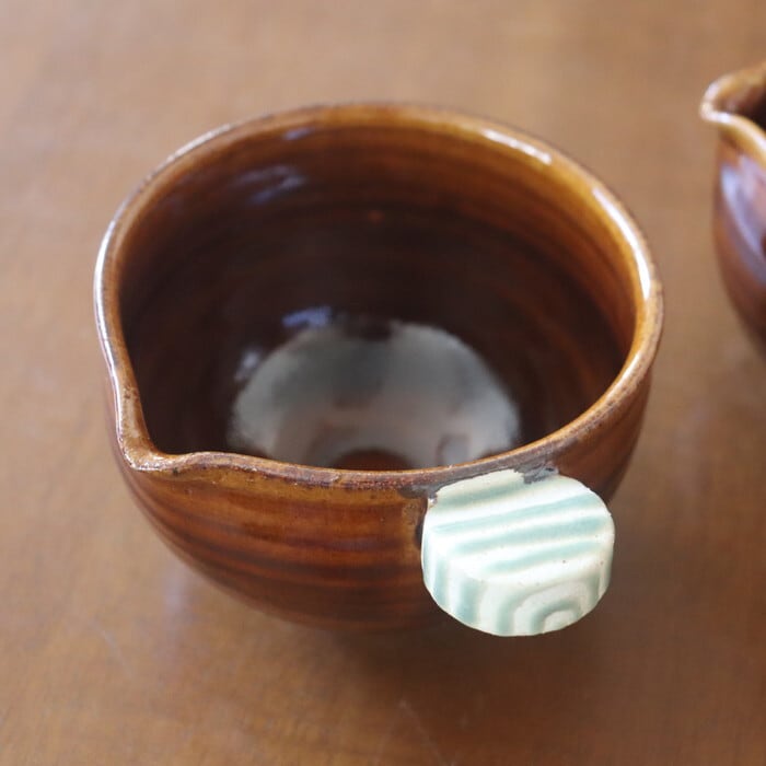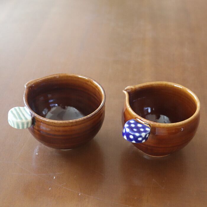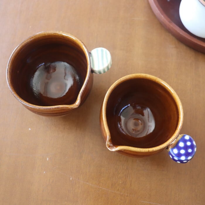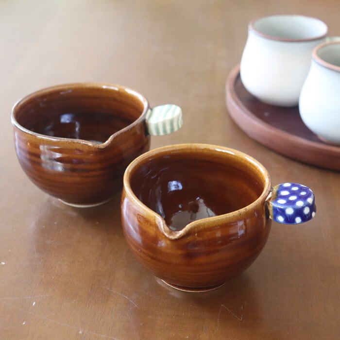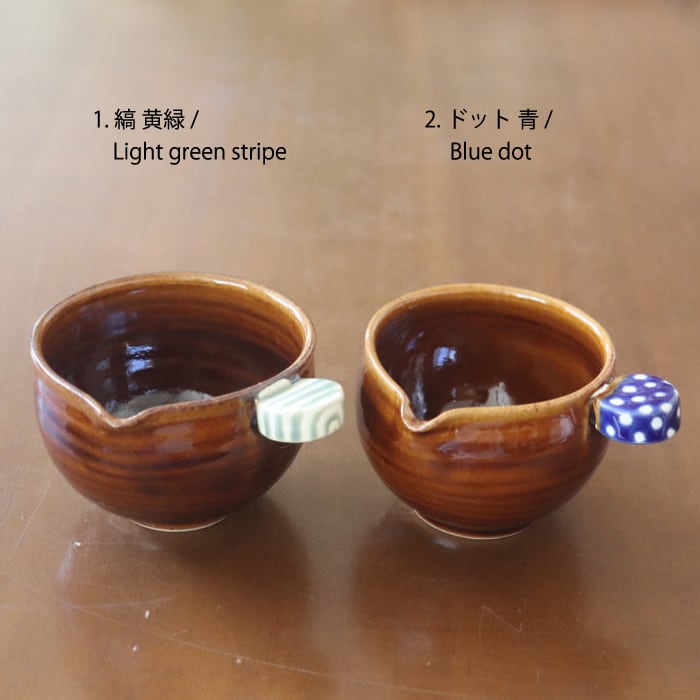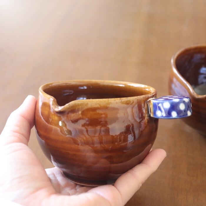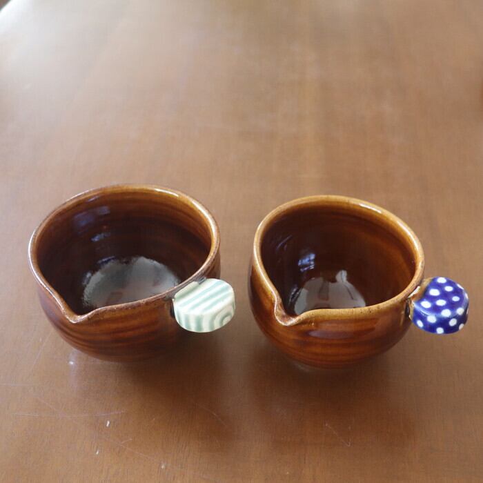 かわいい取っ手がついた益子焼(栃木県)の片口碗。お抹茶をシェアしたり、抹茶ラテやお菓子作りをするときに便利なアイテムです。生クリームを泡立てたり、お酒や手作りポン酢などを入れてもカワイイ。食卓が明るくなります♬