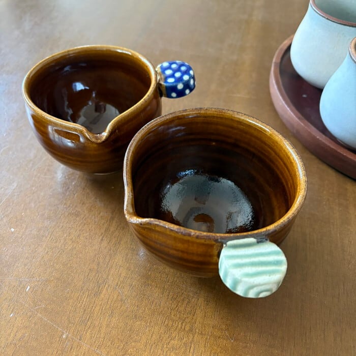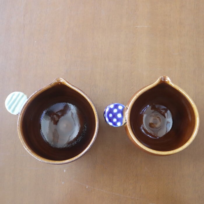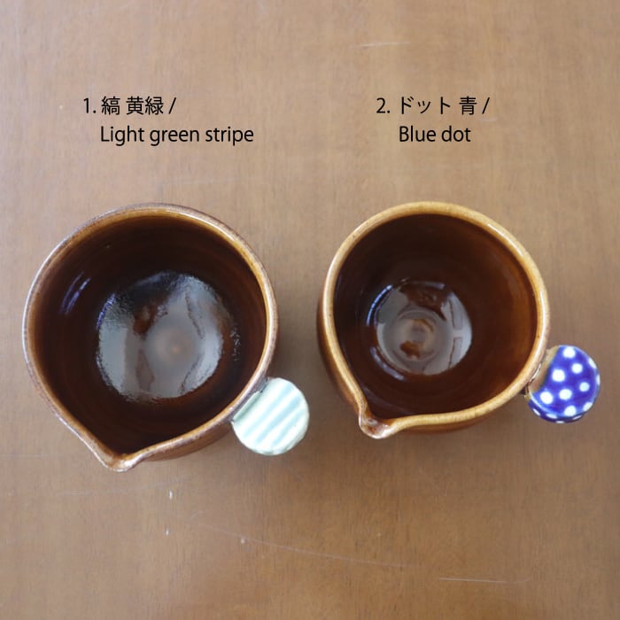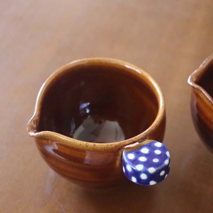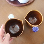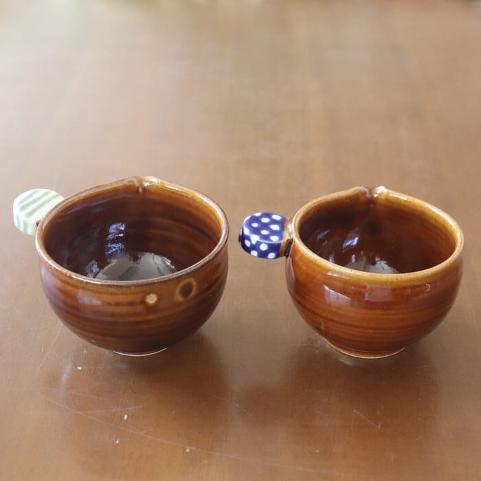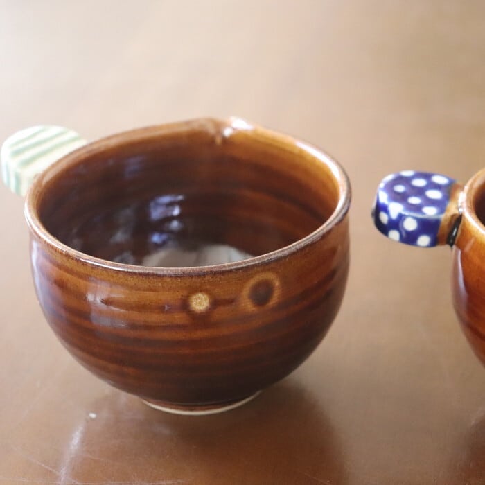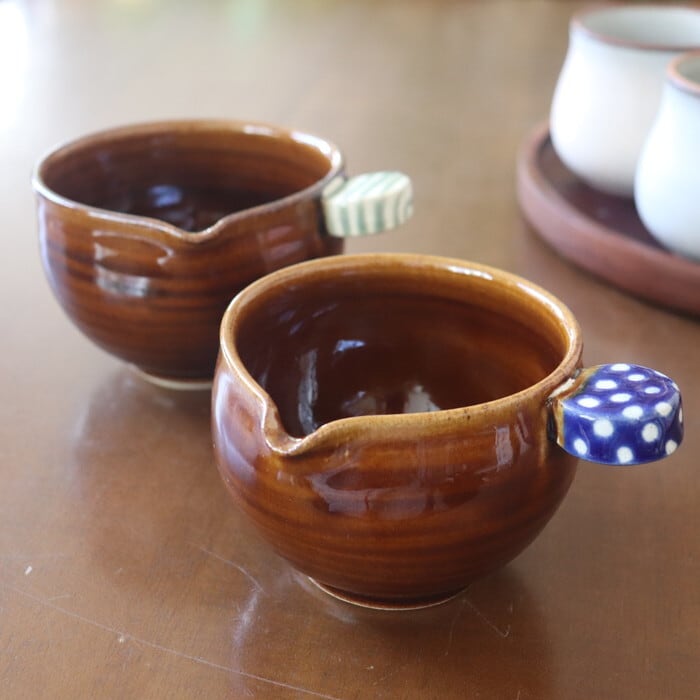 かわいい取っ手がついた益子焼(栃木県)の片口碗。お抹茶をシェアしたり、抹茶ラテやお菓子作りをするときに便利なアイテムです。生クリームを泡立てたり、お酒や手作りポン酢などを入れてもカワイイ。食卓が明るくなります♬