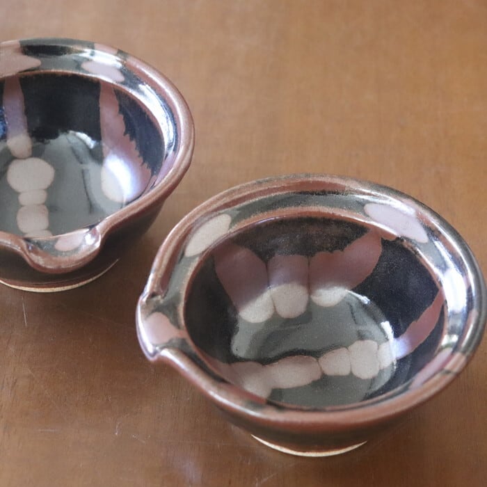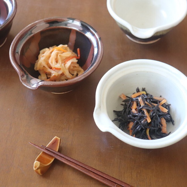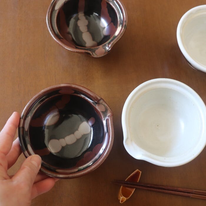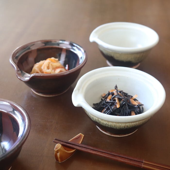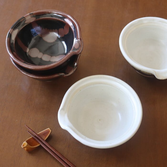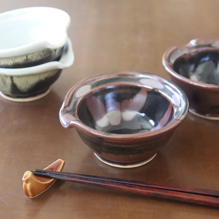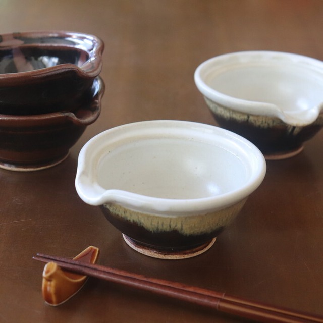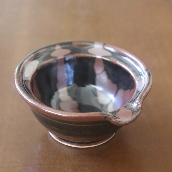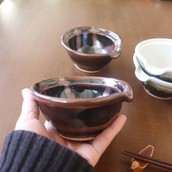 渋い色合いが魅力的な益子焼(栃木県)の片口鉢。卵かけご飯用の卵入れをイメージして作られた鉢だそうで、注ぎ口がついています。サイズ感的には、生卵にはややたっぷりめの大きさですので、納豆鉢としても使いやすい大きさです。昔ながらの益子焼の釉薬を使ったクラシックで落ち着いたデザインは和定食にぴったり♬ 手作りドレッシングを入れても良さそうです。