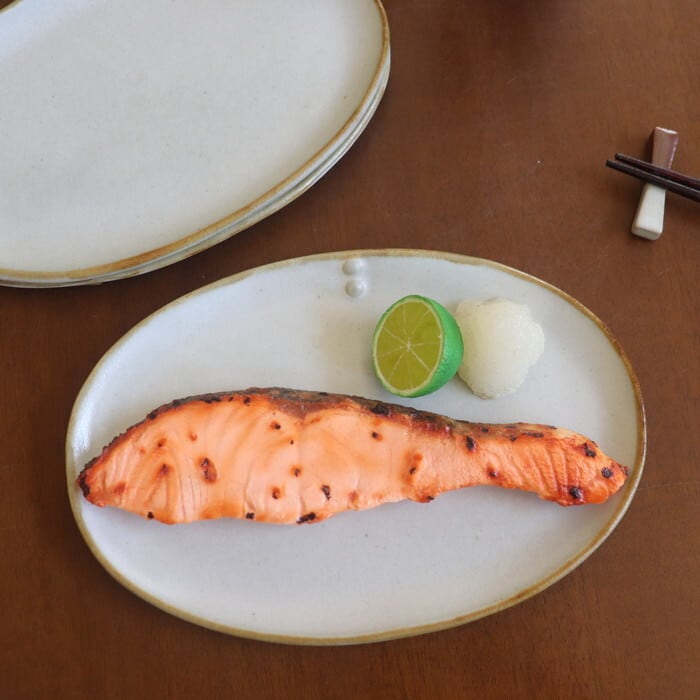 ピタッとフラットな形状の益子焼(栃木県)のオーバルプレート。朝食のおにぎりやおかずを1~2品のせたり、焼き菓子やフルーツなどをのせるのにちょうどよいサイズ感です。シンプルで優しい色合いなので、いろいろな使い方ができそうです♬
