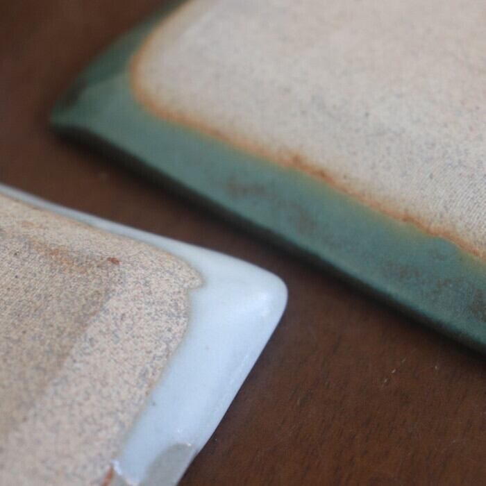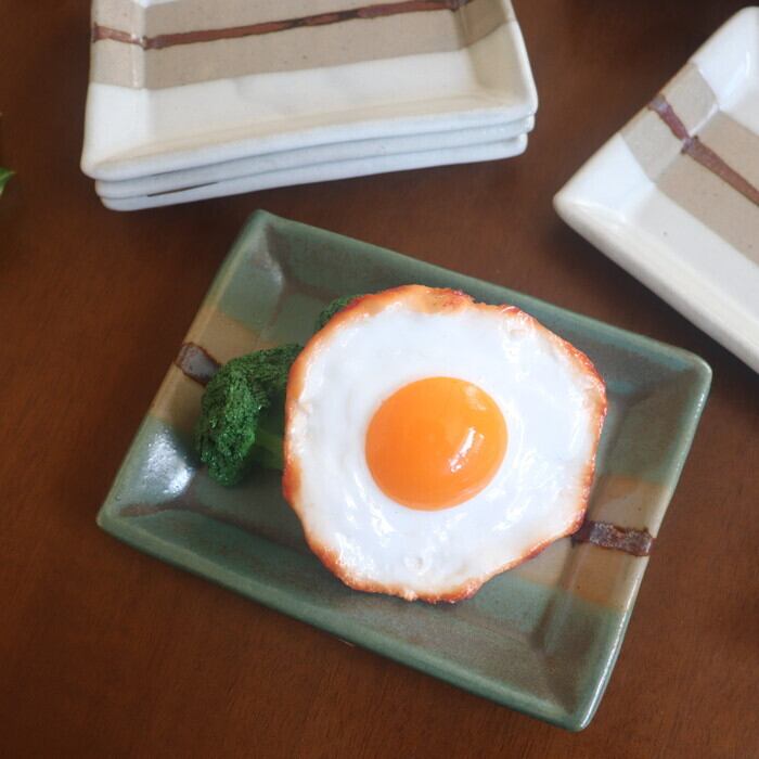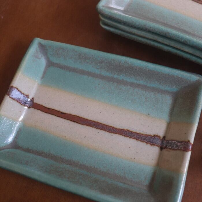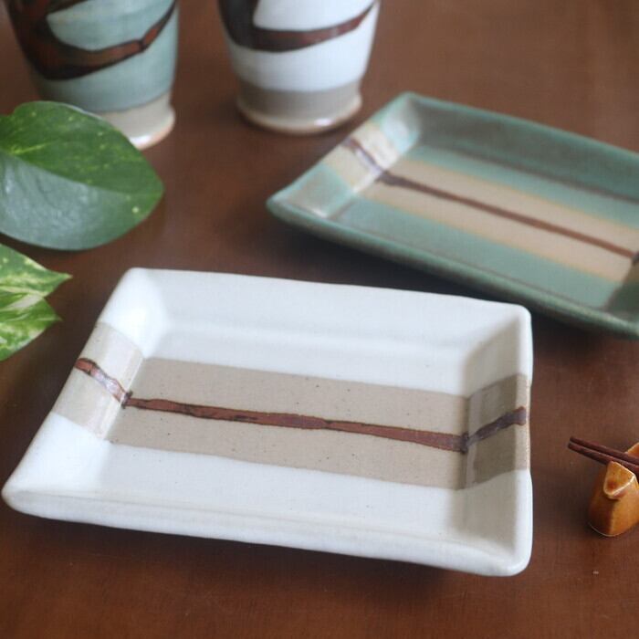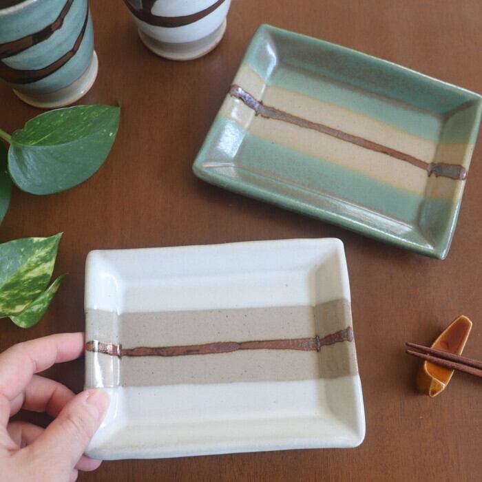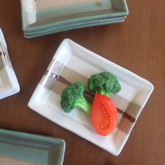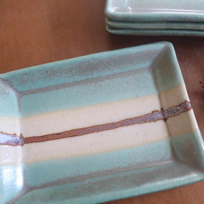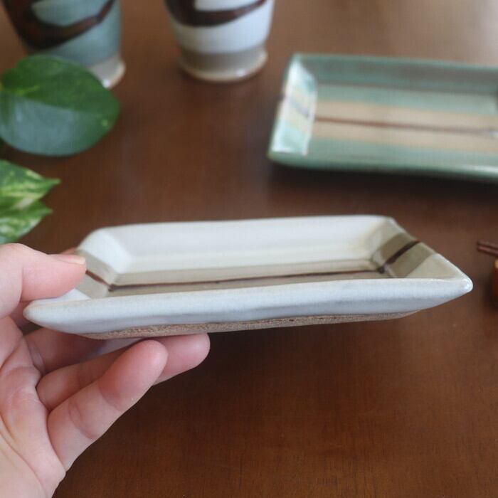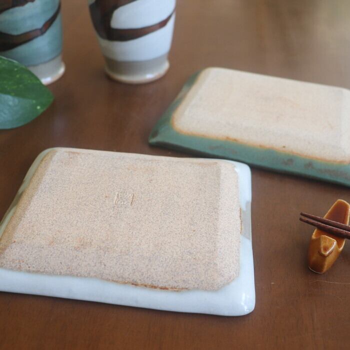 小ぶりなサイズ感の益子焼(栃木県)の四角皿。和菓子や焼き菓子を1つ2つ乗せるのにぴったりな大きさ♪ 板わさやお漬物にも良さそうです。