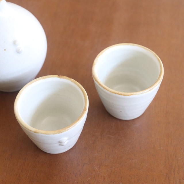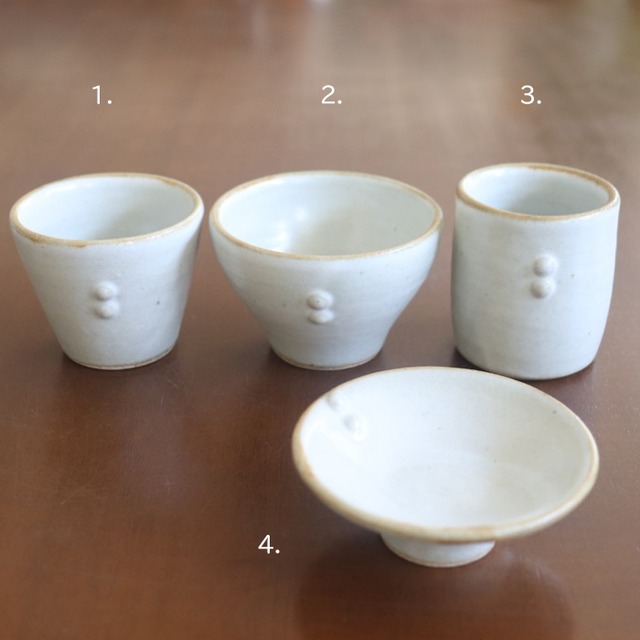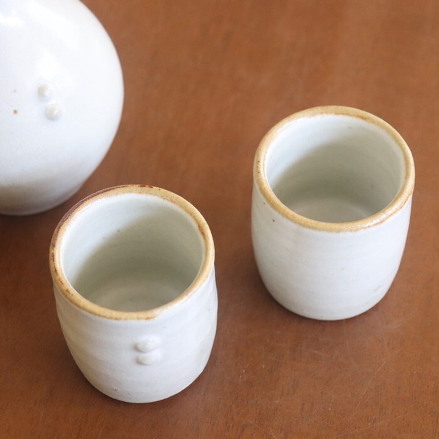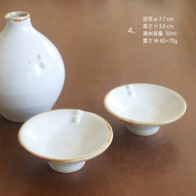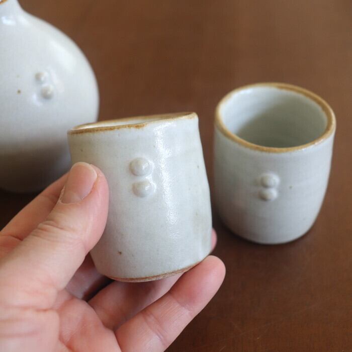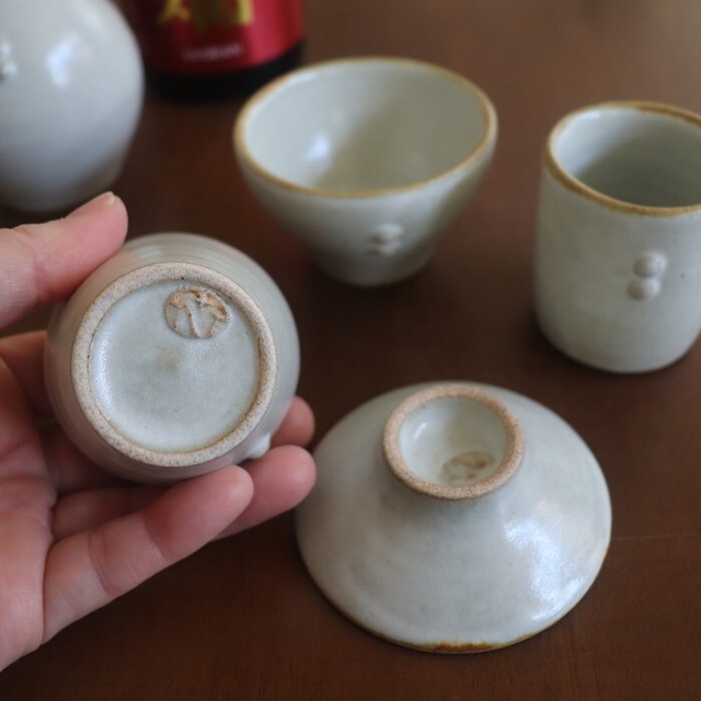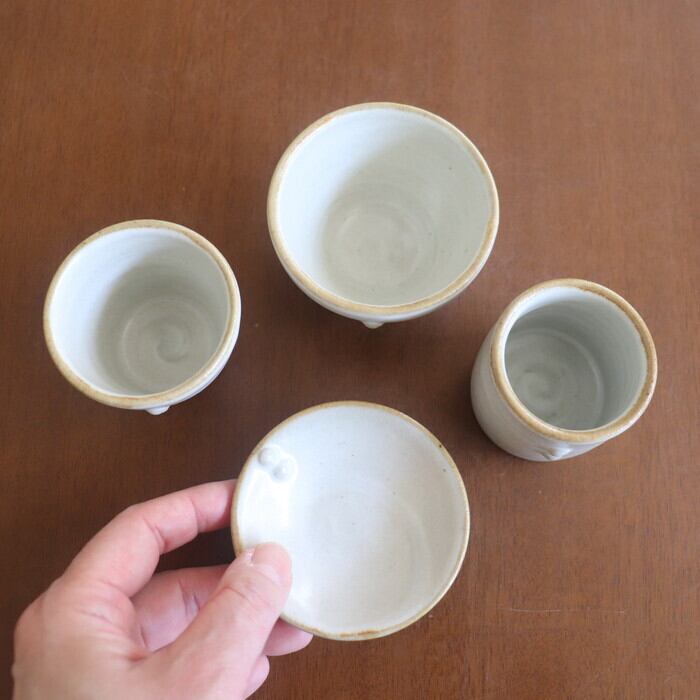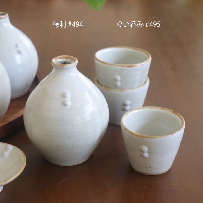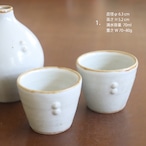 糠白釉の優しい色合いが特徴的な益子焼(栃木県)のぐい呑み。4タイプのデザインそれぞれに、お酒だけではなく、多様な使い方が楽しめそうです。日本酒用には、お揃いの徳利(#494)とセットでどうぞ♬