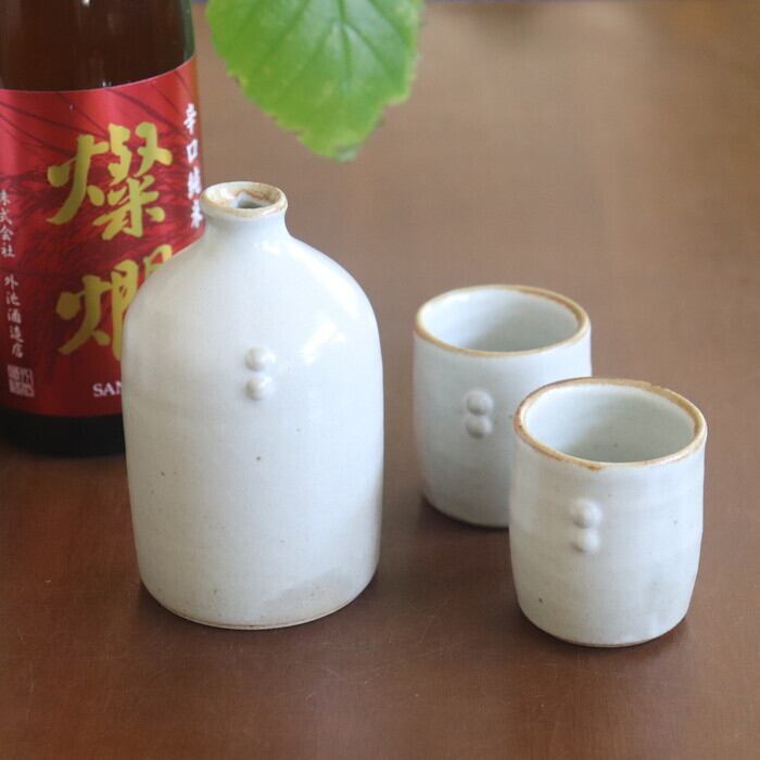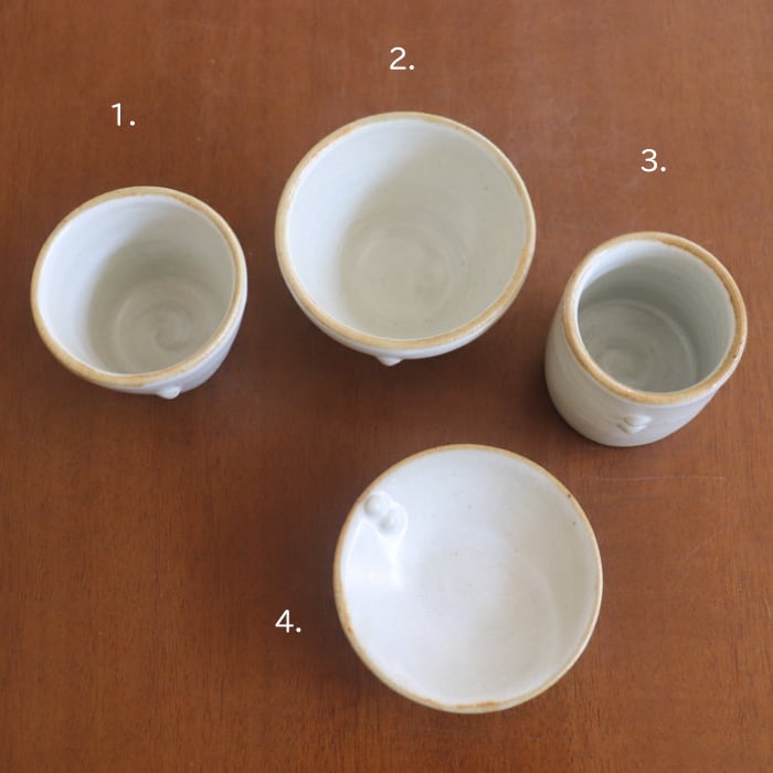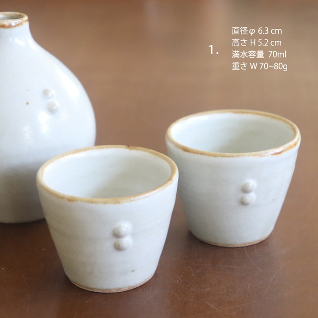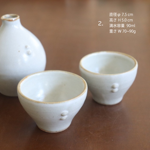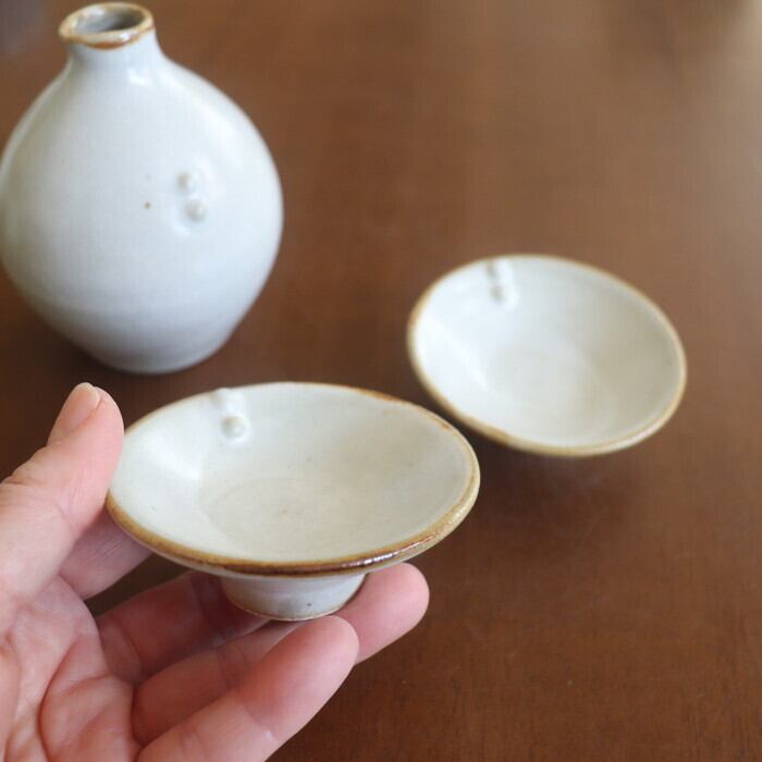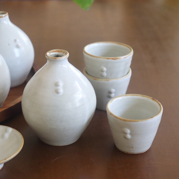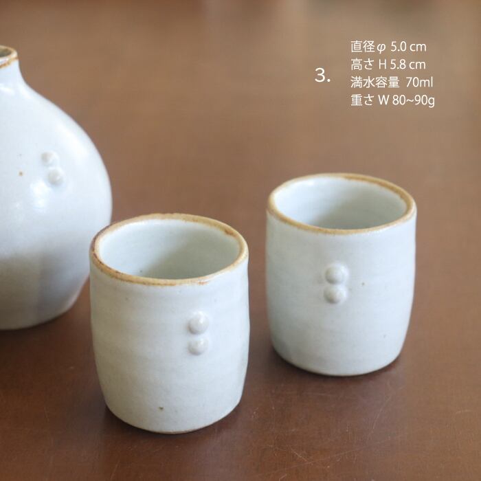 糠白釉の優しい色合いが特徴的な益子焼(栃木県)のぐい呑み。4タイプのデザインそれぞれに、お酒だけではなく、多様な使い方が楽しめそうです。日本酒用には、お揃いの徳利(#494)とセットでどうぞ♬