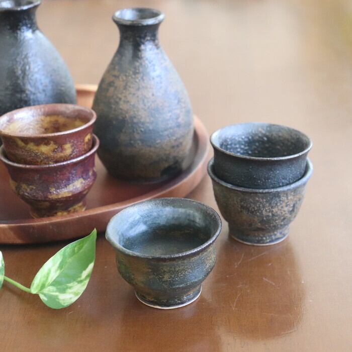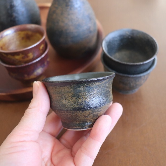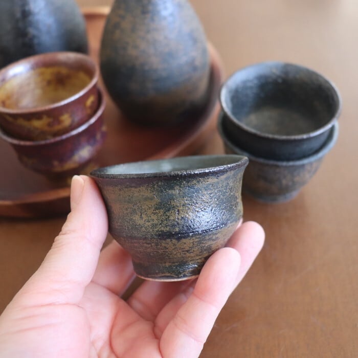 メタリックな質感がカッコいい益子焼(栃木県)のぐい呑み。握りやすく程よいサイズ感。小さすぎないので、お酒好きさんにも満足いただけそうな大きさです。