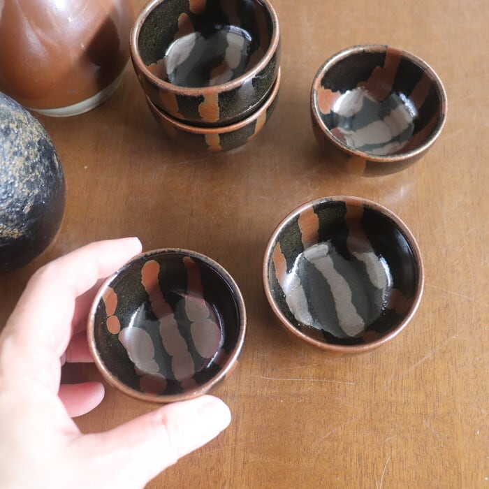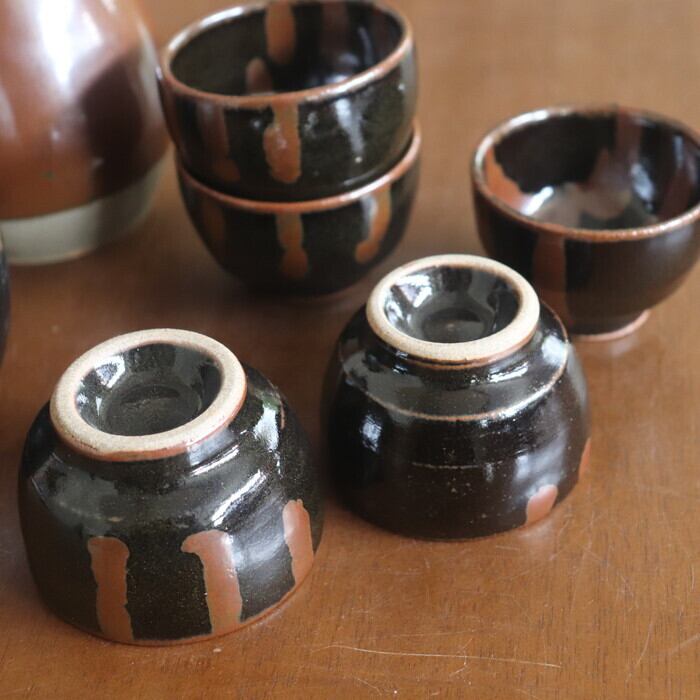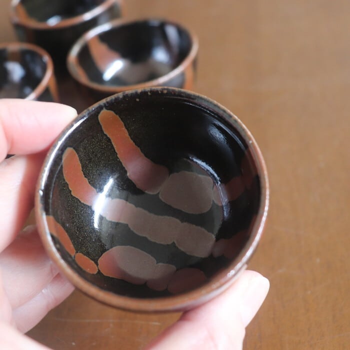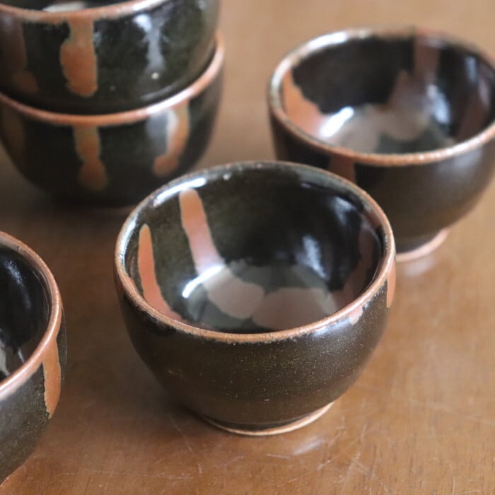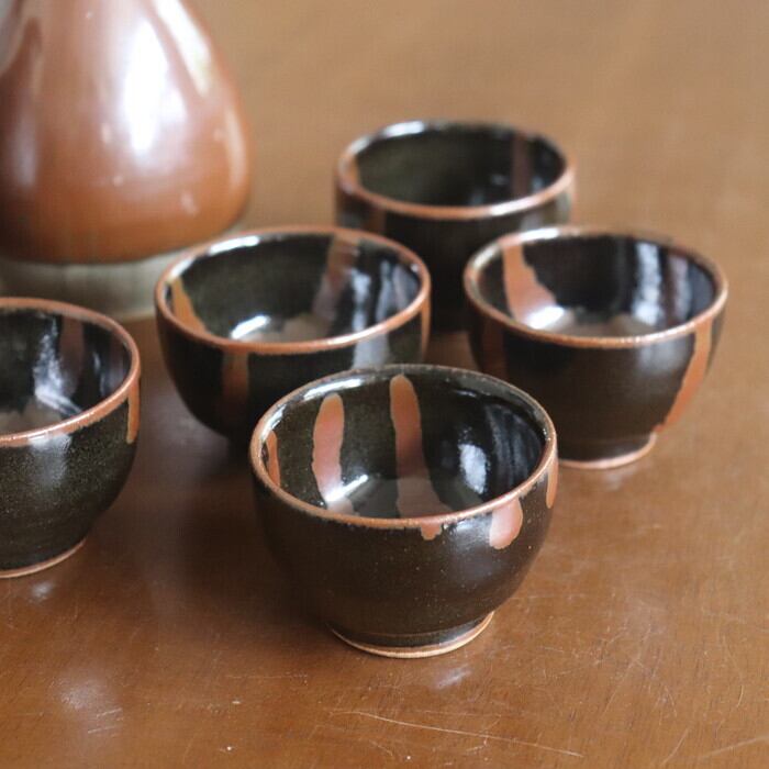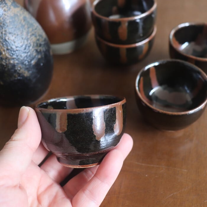 昔懐かしい色合いの益子焼(栃木県)のぐい呑み。やや丸っとしたフォルムで、握りやすく程よいサイズ感。小さすぎないので、お酒好きさんにも満足いただけそうな大きさです。黒釉をベースに柿釉(茶)を流したデザインは、昔から益子焼で愛されてきたクラシックなパターンの一つ。古き良きを感じさせつつも、モダンな趣で、贈り物にも喜ばれそうです。
