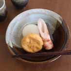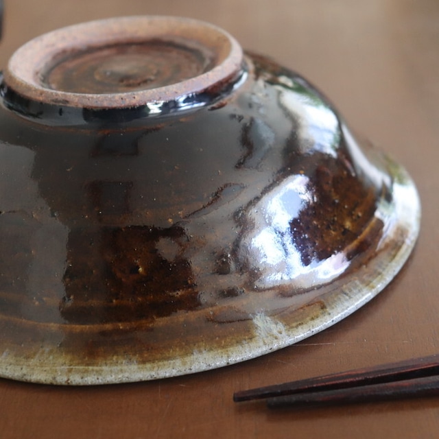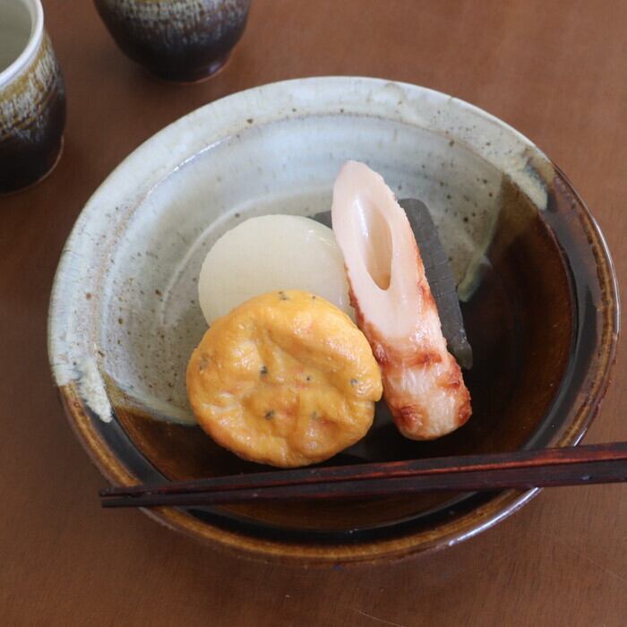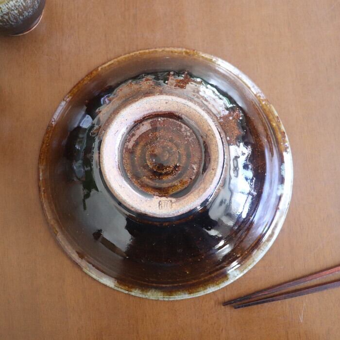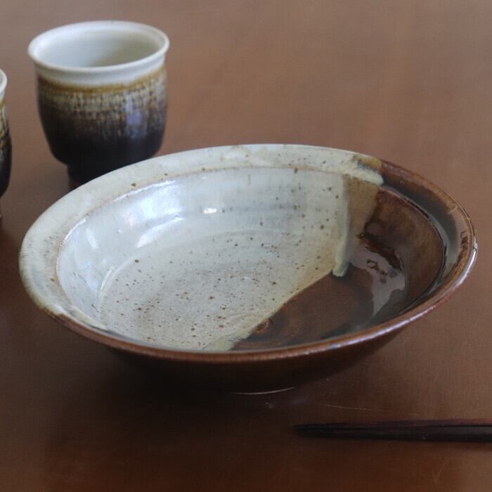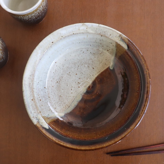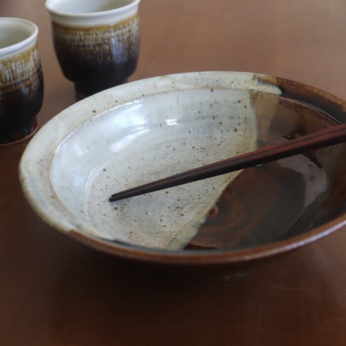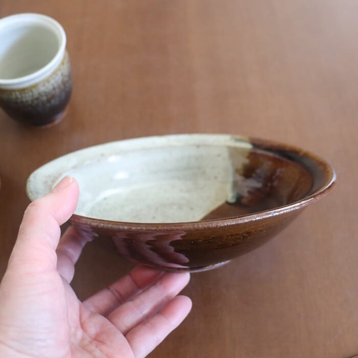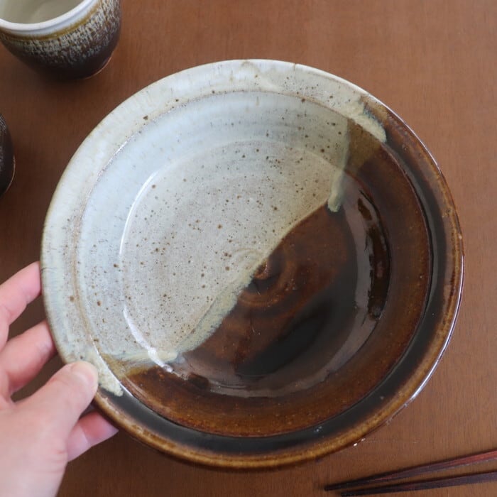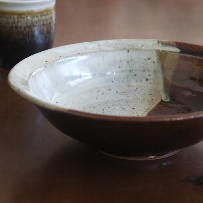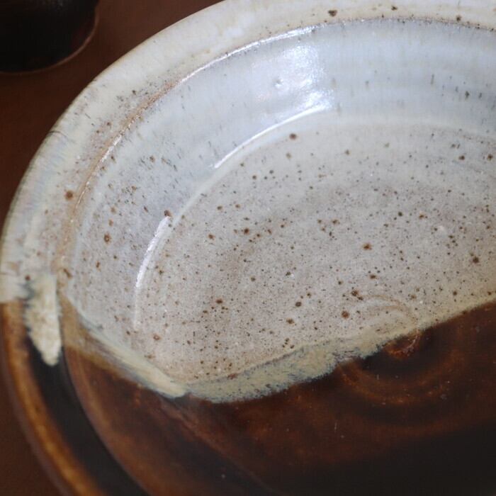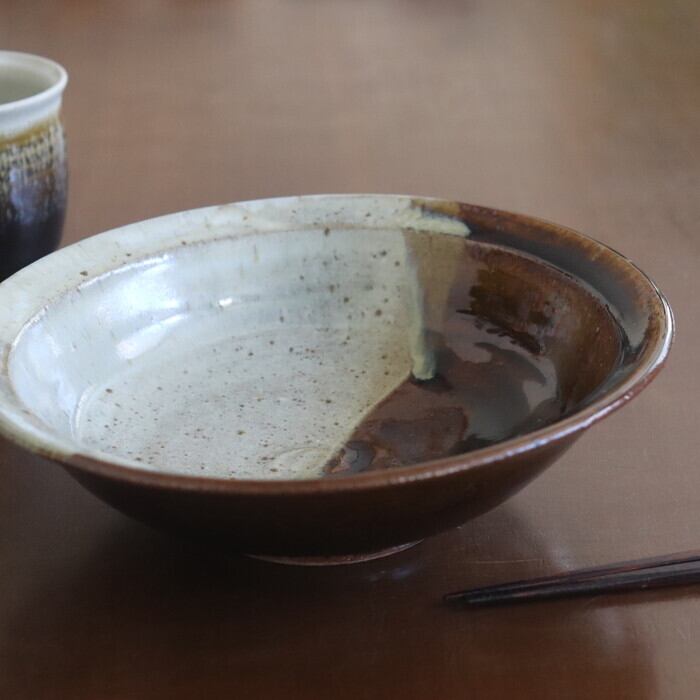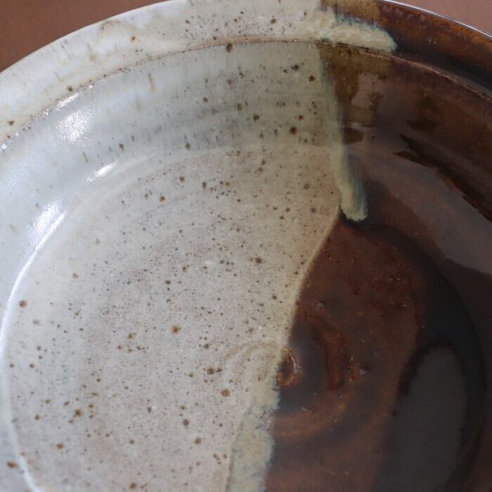 素朴な雰囲気の益子焼(栃木県)の7寸鉢。しっかり深さがあるので、煮物や揚げ物、サラダなどの大皿料理にぴったりです。落ち着いた色合いの飴釉(黒茶)と糠白釉(クリームがかった灰色?)を掛け分けたバイカラーのデザインは、どこか懐かしく、温かな仕上がりに。大家族の食卓や、家庭料理店のおばんざいにぴったり♬