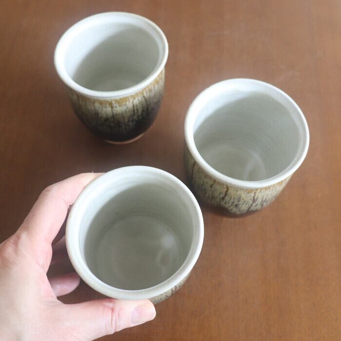 大きめサイズの益子焼(栃木県)の筒湯呑み。手のひらに収まりやすい形状で、高台(こうだい;湯呑の底部分)もしっかりしているので、熱いお茶を飲むときにも安心感があります。