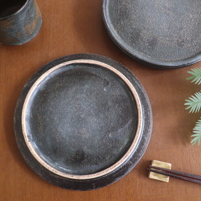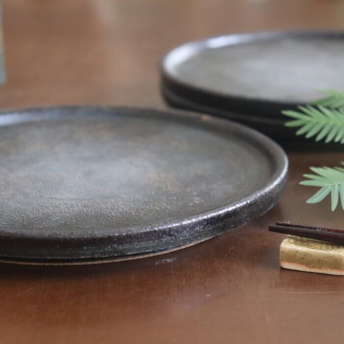 メタリックのような輝きを放つ益子焼(栃木県)のリム付プレート。フラットな形状で、1品料理からケーキまで使いやすいサイズ感。お刺身やお寿司、焼き魚などを合わせて和風に、生春巻きやエビチリを合わせてアジアンに、と、和洋問わずに活用いただけそうです。