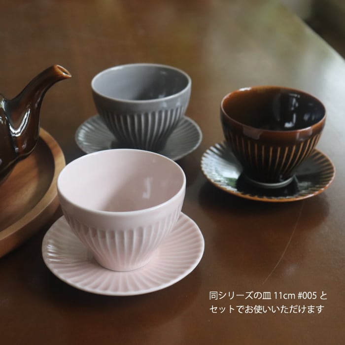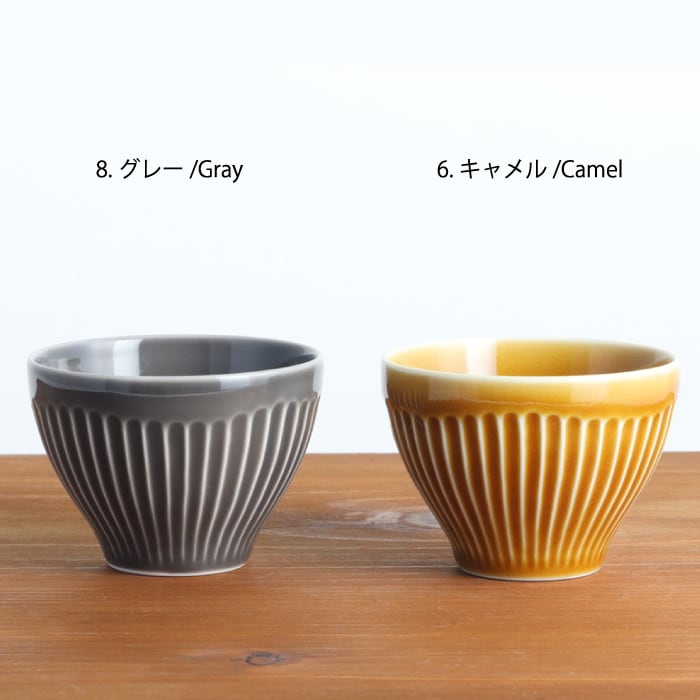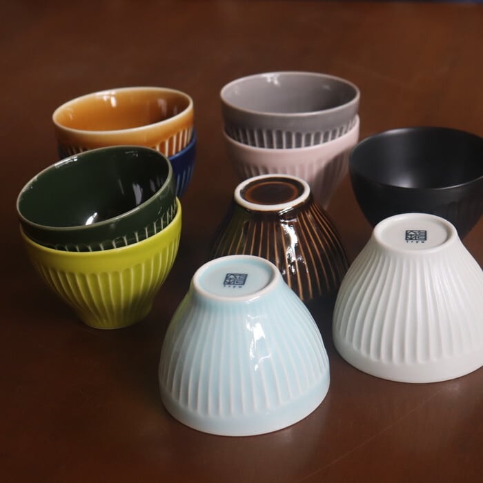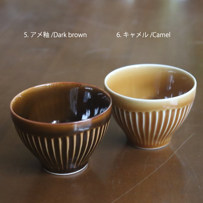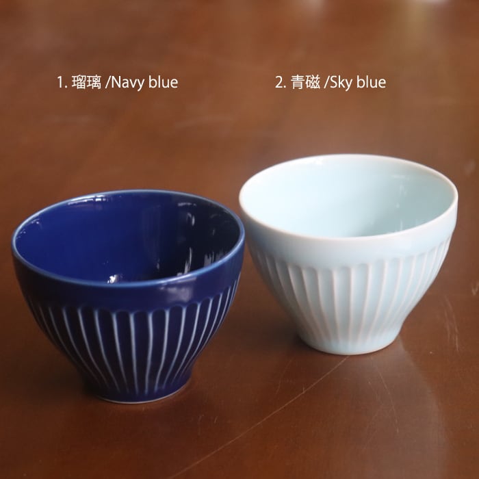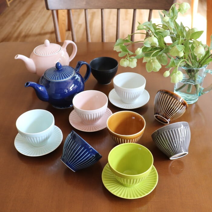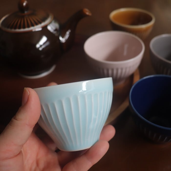 波佐見焼(長崎県)の湯呑み。片手にスポンと収まるサイズ感で、手なじみが抜群です。表面を等間隔で削った鎬(しのぎ)の文様とコロンとしたフォルム、鮮やかな色が美しく、色違いで揃えたくなります。同シリーズの皿(11cm)を茶たくにすれば、大切なお客様用にも便利です。夏は、ゼリーやアイスクリームを入れても涼しそうですね。