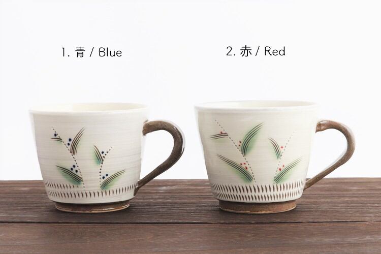 小石原焼(福岡県)のマグカップ。取手は指2本が入るサイズ感で、両掌で抱えるのに手なじみの良い大きさです。表面を削って描き出した繊細なデザインは、シソ科の植物の紫式部をモチーフにしたもの。軽やかで洗練された雰囲気で、ティータイムを優雅に演出してくれそうです。青・赤の2色展開なので、来客用やプレゼント用にもぴったりです。
