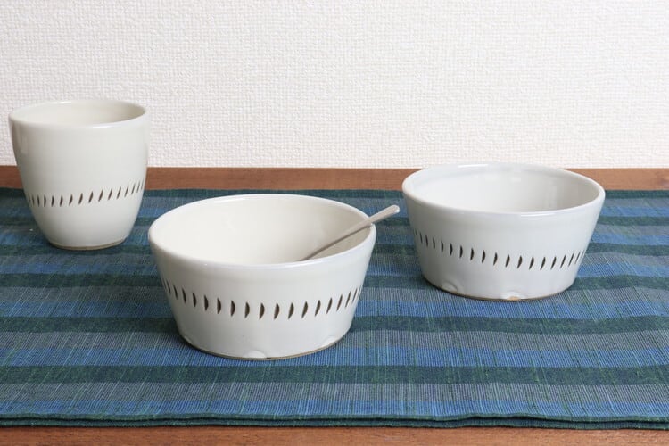 手仕事でつくられる器は、ひとつひとつ形や大きさ、色合いなどに個体差があります。形の歪みや色むら、釉たれ、ピンホールなどがある場合がありますが、量産品にはない「個性」として、手仕事ならではの味わいをお楽しみください。