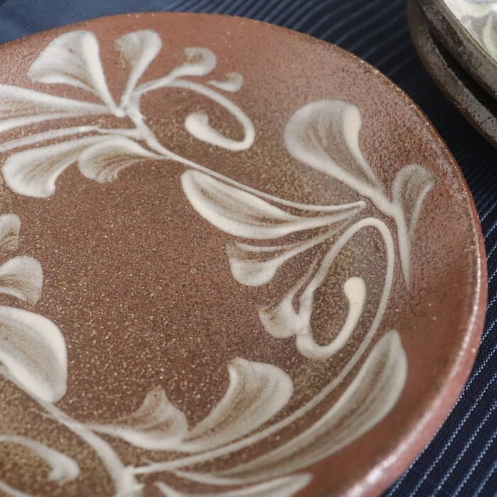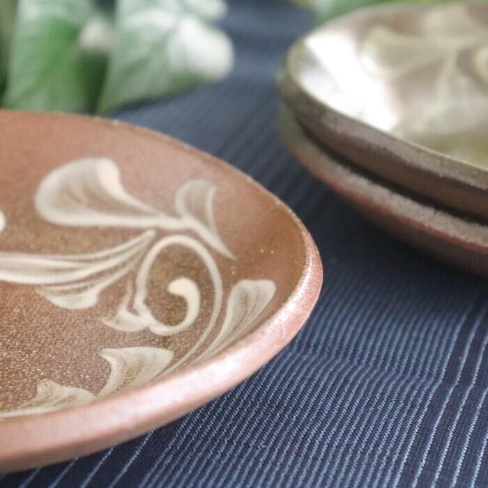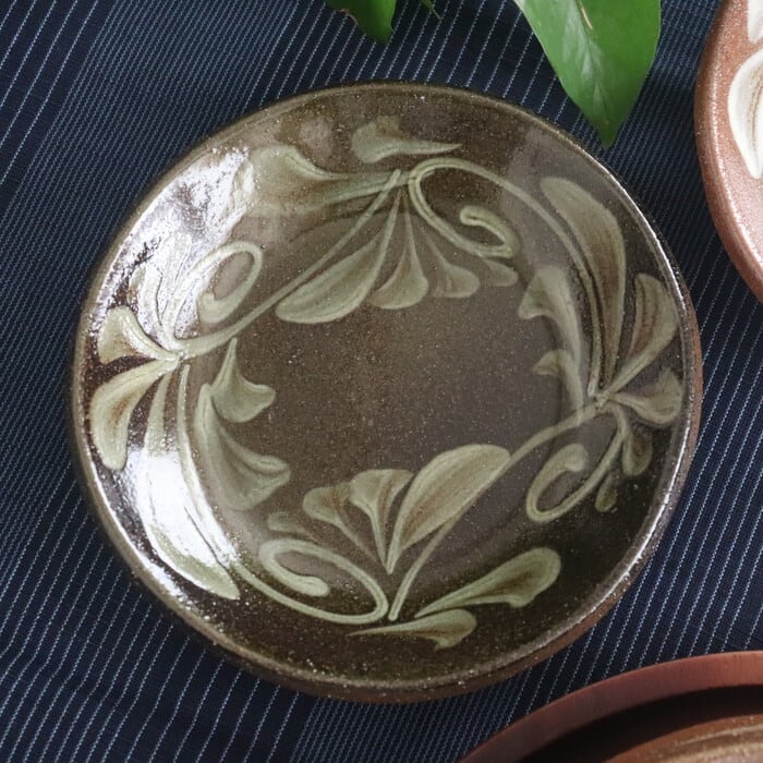 やちむん(沖縄の焼き物)の5寸皿。ボテっとした厚み(約5mm)と重さがあり、表面はざらざらした土の感触。その素朴な土台に、いっちんという技法でぷくっと立体的な唐草模様が描かれています。上品なデザインで中央部分がフラットなので、小さめのケーキなど合いそうです。
