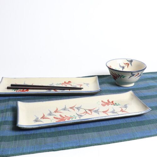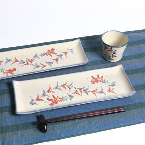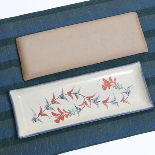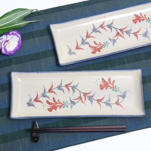 やちむん(沖縄の焼き物)の長角皿。秋刀魚の塩焼きにぴったりのサイズです。沖縄県の花「デイゴ」をモチーフにした華やかなデザインは、置くだけで食卓が明るくなりそう。チーズや生ハム、白身のお刺し身など、シンプルな食材が引き立ちます。お気に入りの焼菓子やミニケーキを並べて午後のティータイム、なんてのも素敵ですね。