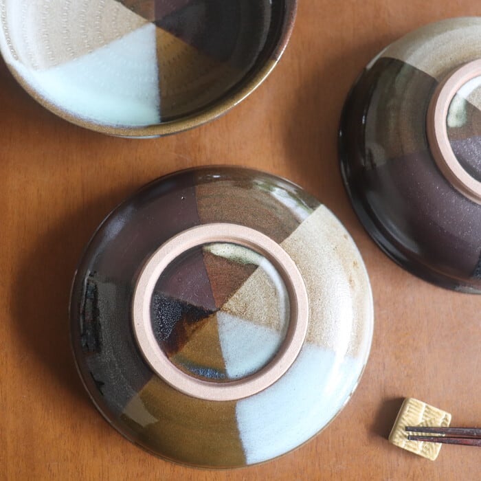 小石原焼(福岡県)の取り鉢。内部がフラットなので、深皿としても煮物鉢としても活用しやすい形とサイズ感です。6色の釉薬が放射線状に掛け分けられたモダンなデザインですが、落ち着いた色味なので、和食、洋食、中華、アジアンなど、いろんな料理をおしゃれにまとめてくれます。ごはんモノのどんぶりやペンネ、ビーフンなどにも良さそうです。