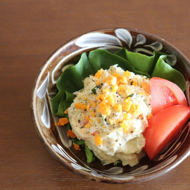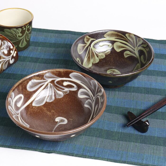 やちむん(沖縄の焼き物)の5寸鉢。サラダや煮物など、1~2人前用にちょうど良いサイズです。土の温もりを感じるラザラした素朴な土台に、それぞれ白と淡い緑の唐草がいっちん技法で伸びやかに描かれています。土台の色味は、緑のほうがやや濃いめの黒茶。土の素材感とシンプルな色のコントラストが美しく、華やかで上品な雰囲気のデザインです。カラフルなフルーツや焼き菓子などと相性が良さそうです。
