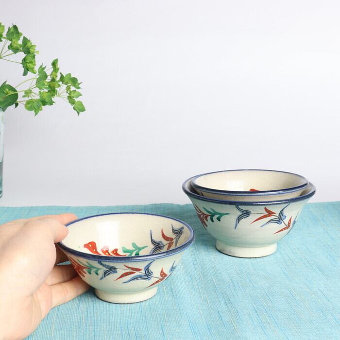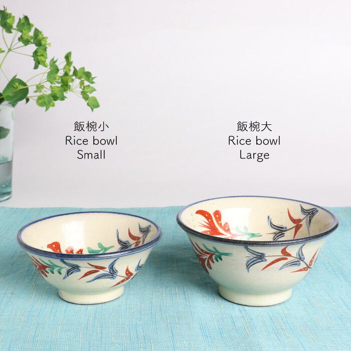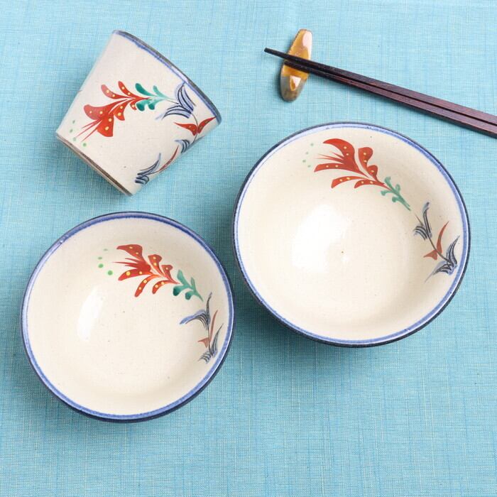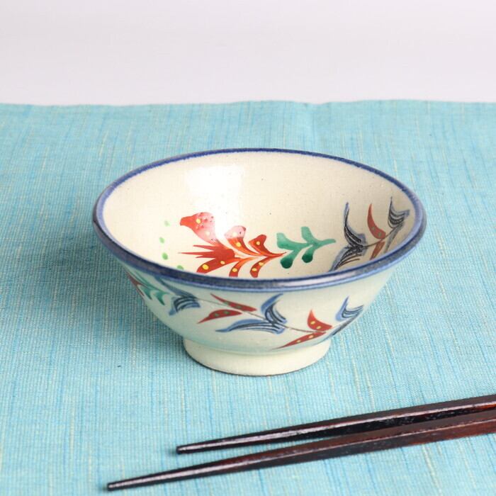 沖縄県の花「デイゴ」をモチーフにした華やかなデザインは、茶碗の外側と内側の両方に描かれており、使うたびに気分が明るくなりそうです。小ぶりで一見するとご飯茶碗っぽく見えないので、小鉢としても使いやすそうです。
