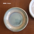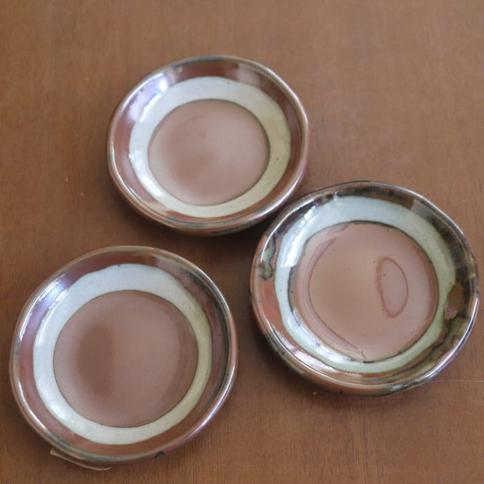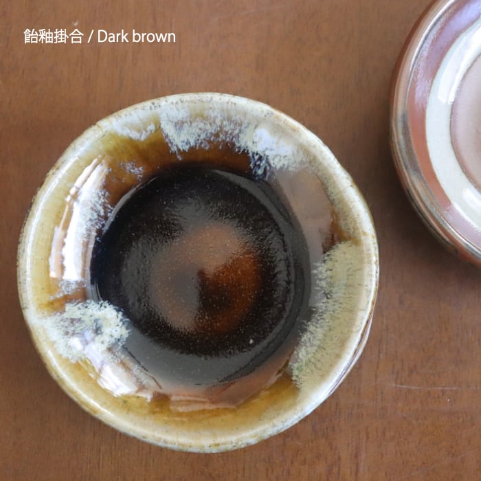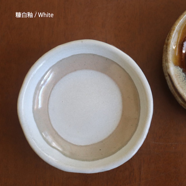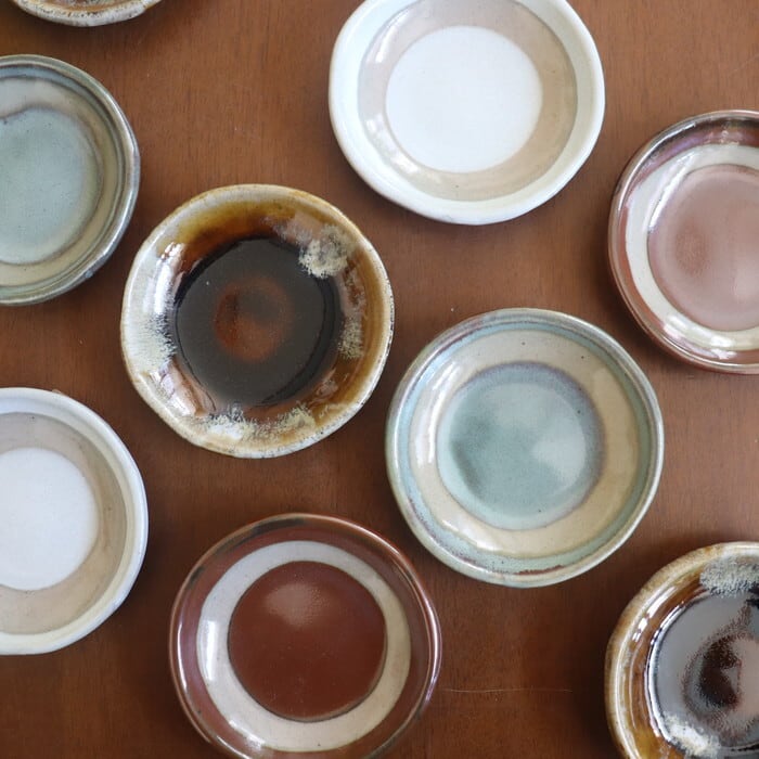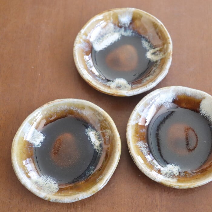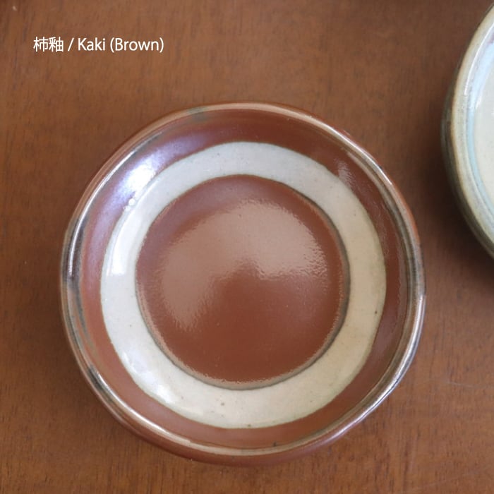 益子焼(栃木県)の3寸プレート。程よく深さがあり、お醤油などのたれ皿にぴったりのサイズです。伝統的な柿釉(茶色)、青磁釉(青)、糠白釉(白)を使ったかわいらしいデザインと、飴釉(濃茶)のベースに藁灰釉(クリーム色)を掛け合わせたカッコいいデザインの4種類。ぽてっとした厚みが手に馴染み、持ち上げやすいのも嬉しい魅力です。