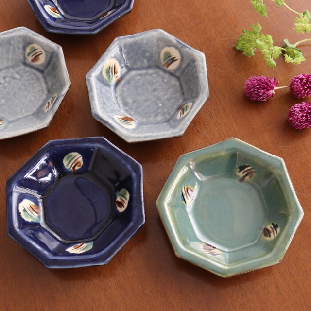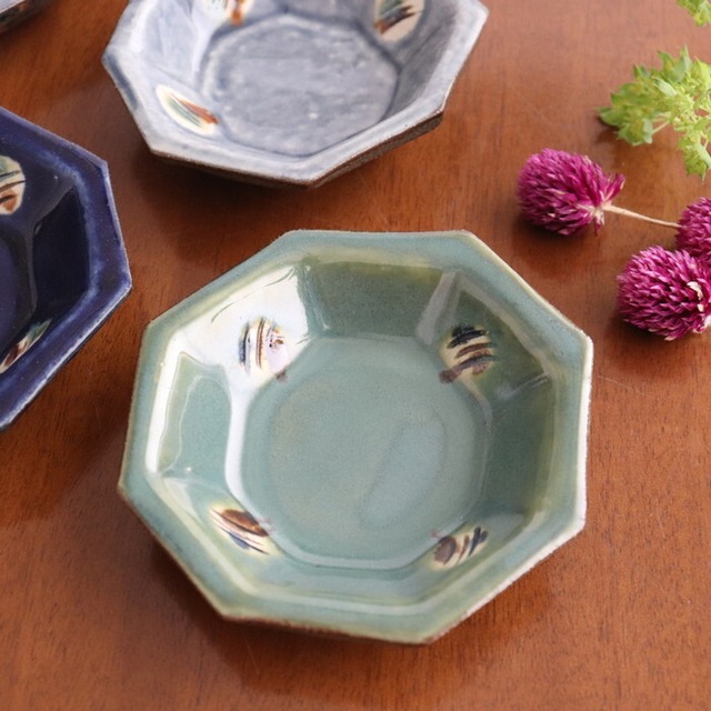 やちむん(沖縄の焼き物)の八角小皿。お漬物やキンピラなどの1品惣菜、ソース皿などに使いやすいサイズです。鮮やかな色がパッと気分を明るくしてくれるので、ティータイムにクッキーやチョコレートを添えるのも楽しみ ♪ ほどよく深さがあるので、アクセサリーなどの小物入れにも良さそうです。
