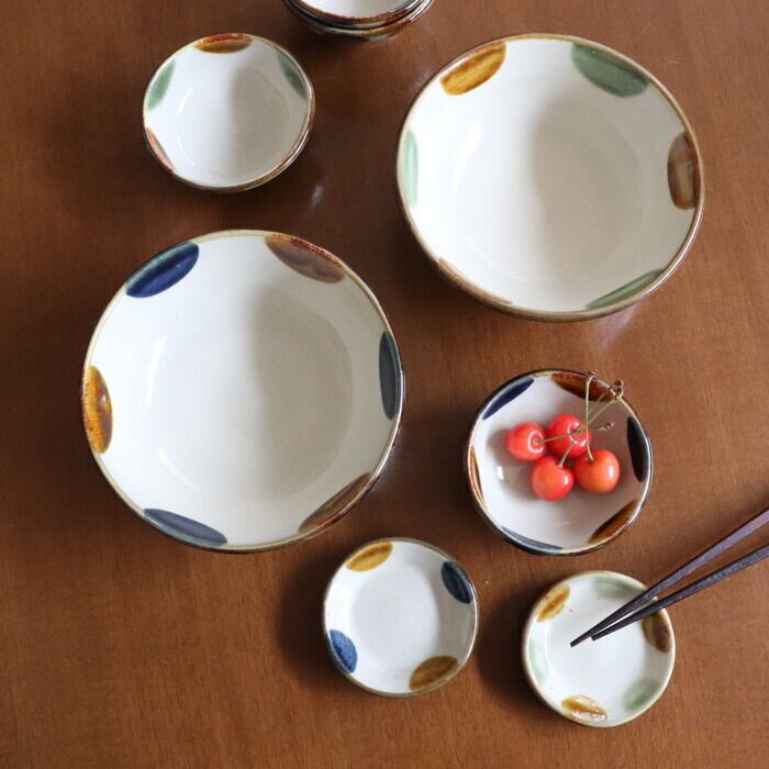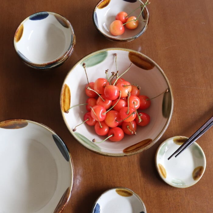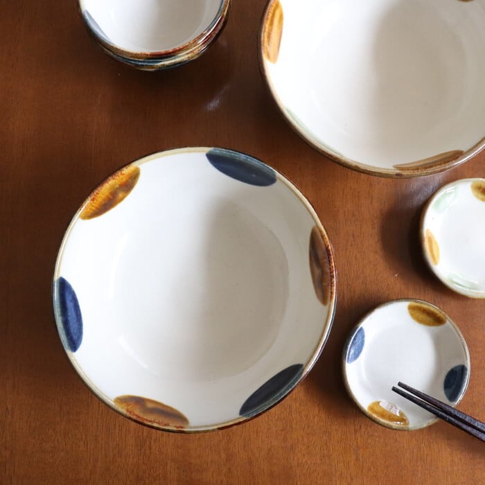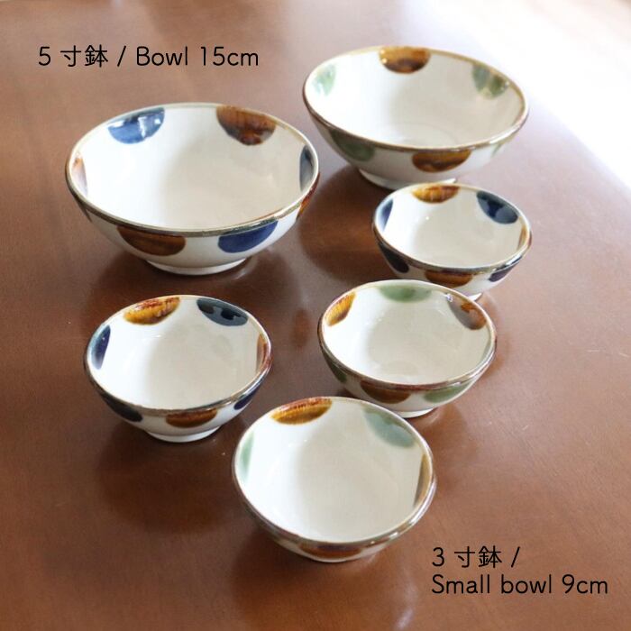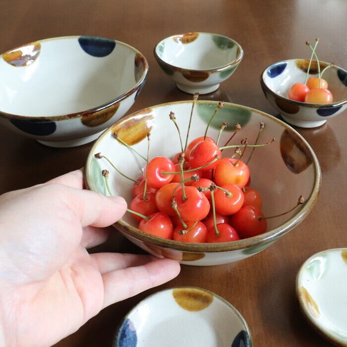 やちむん(沖縄の焼き物)の5寸鉢。サラダや煮物など1~2人前用のおかずや、ご飯もののどんぶり、シチューなどにもちょうど良いサイズです。クリーム色の素朴な土台の内側と外側に2色のドットが描かれた可愛らしいデザインは、盛り付けしやすく使い勝手も抜群。夏はツルっとぶっかけ素麺などもよいですね♪