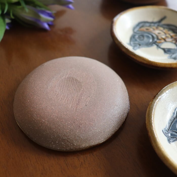 やちむん(沖縄の焼き物)の豆皿。ボテっと厚みのある素朴な土台にハマフエフキダイ(沖縄でタマンと呼ばれ親しまれているお魚)をモチーフにした魚紋が施されています。お漬物や薬味などの添え物に重宝するミニサイズ。同シリーズのそば猪口とセットでご利用いただくのもオススメです♪