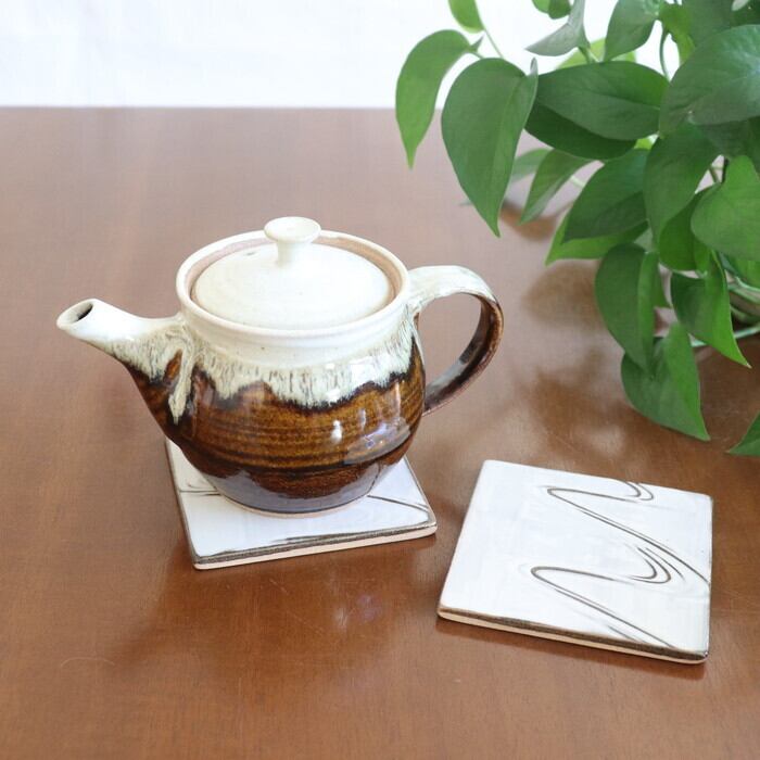 小石原焼(福岡県)の陶器のコースター。つるんとした白化粧の土台に、流れるような櫛目(クシメ)の模様が施されています。白と茶色のシンプルなデザイン。しっかり厚みと重厚感がある作りなので、ミルクポットやティーポットなどの敷物としてもご活用いただけそうです。