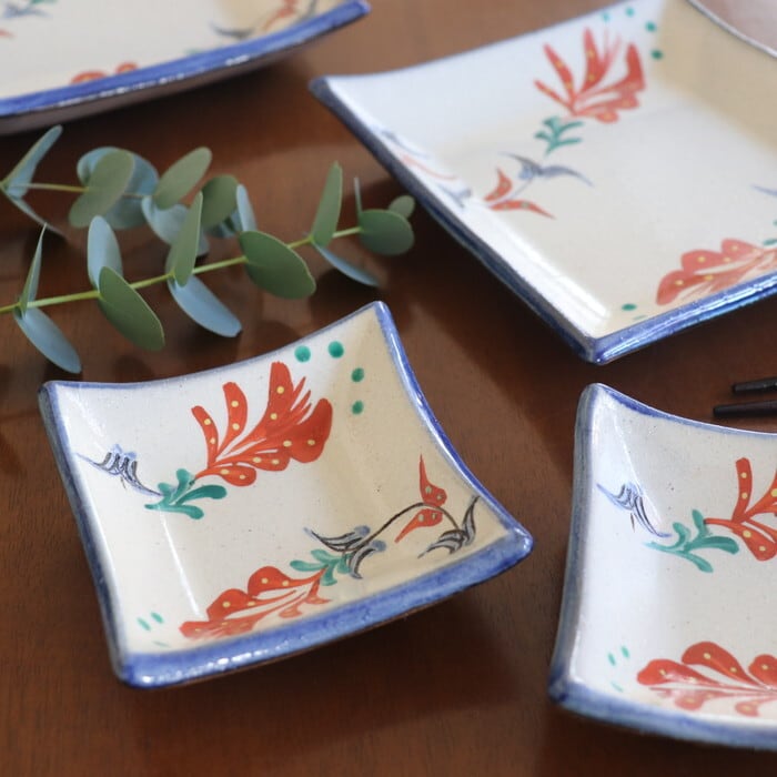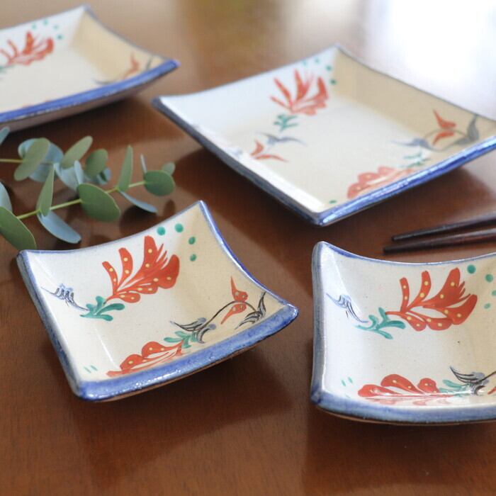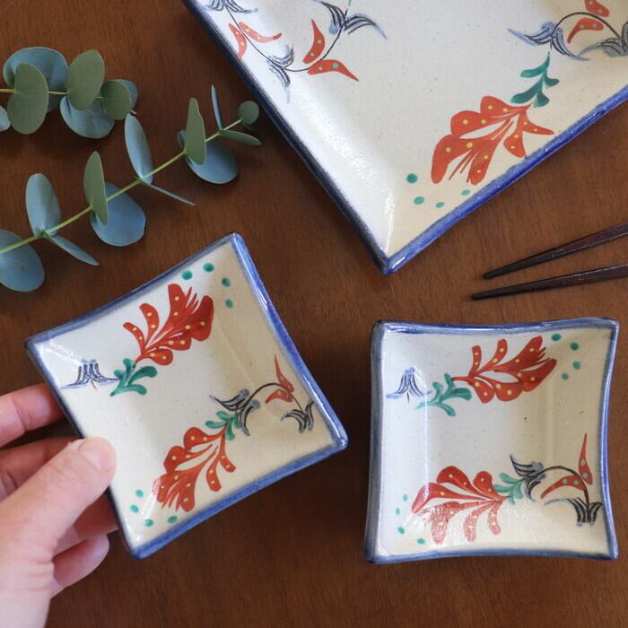 やちむん(沖縄の焼き物)の四角皿。ボテっとした厚み(約5mm)の小皿で、カットフルーツやオリーブ、お浸しやお漬物などの1品総菜をのせるのに使いやすいサイズです。ザラっとした質感の土台に、赤、緑で色鮮やかなデイゴの花が描かれ、華やかでウキウキするデザイン。高級チョコや一口ケーキなどのおやつ皿にもオススメです。