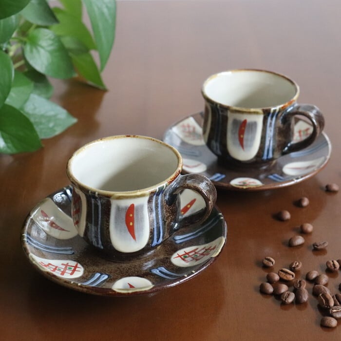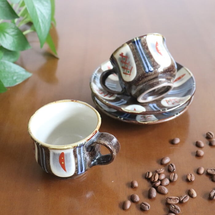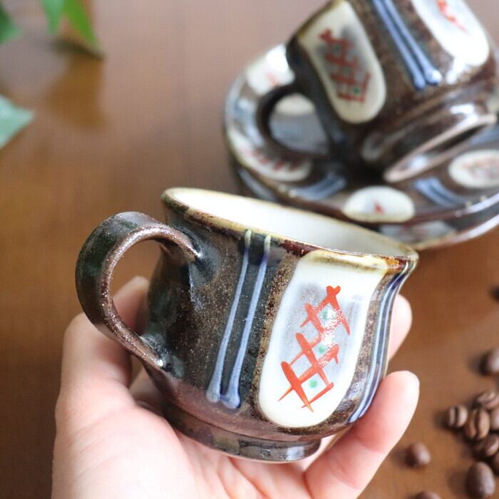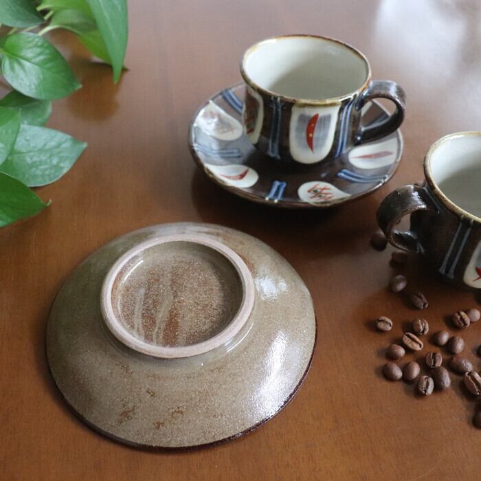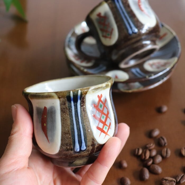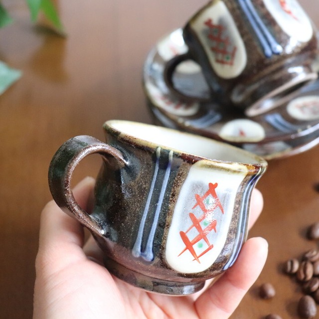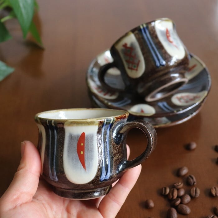 ザラリとした濃い茶色の土台に、白、赤、緑、青を用いた色鮮やかな模様が施されたデザインは、華やかな雰囲気。コーヒータイムを優雅に演出してくれそうです。