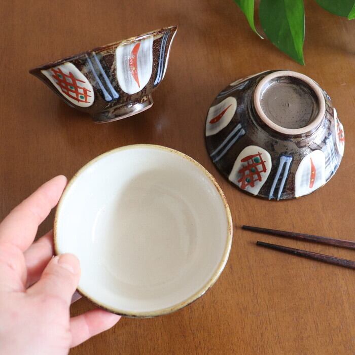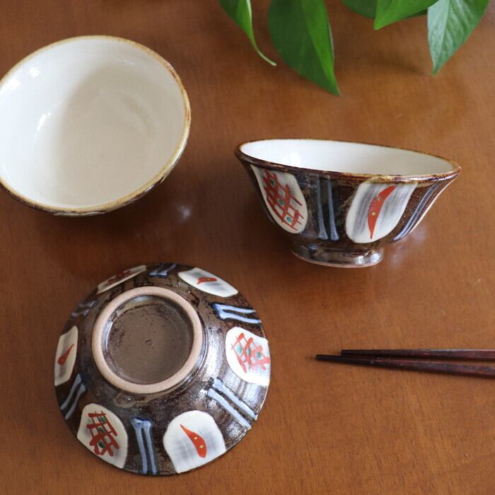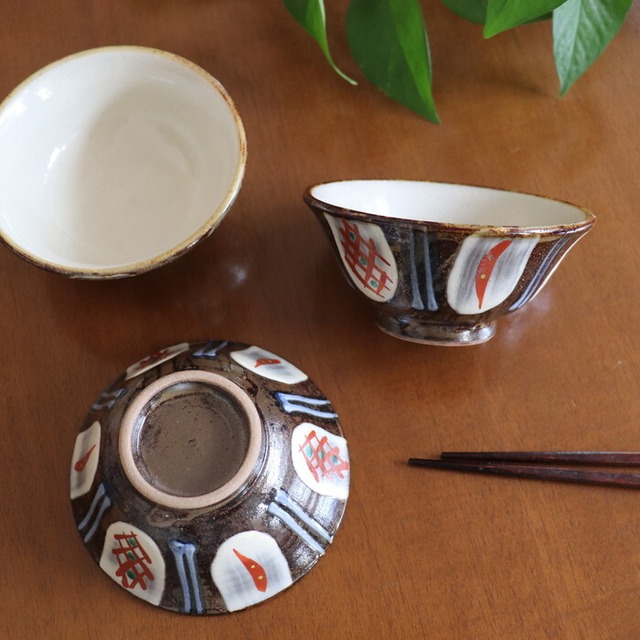 ザラリとした濃い茶色の土台に、白、赤、緑、青を用いた色鮮やかなデザインは、落ち着いていながら華やかな雰囲気。ご飯茶碗はもちろん、小鉢としても使いやすそうです。