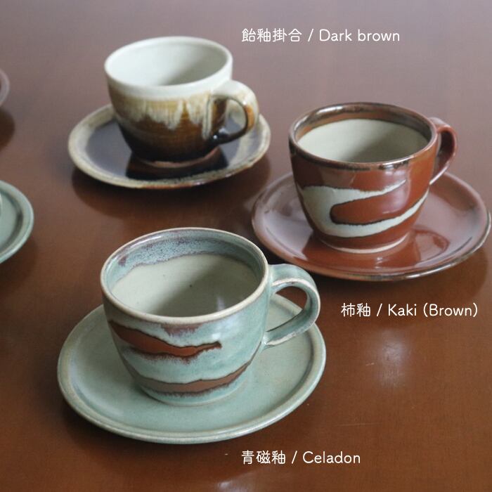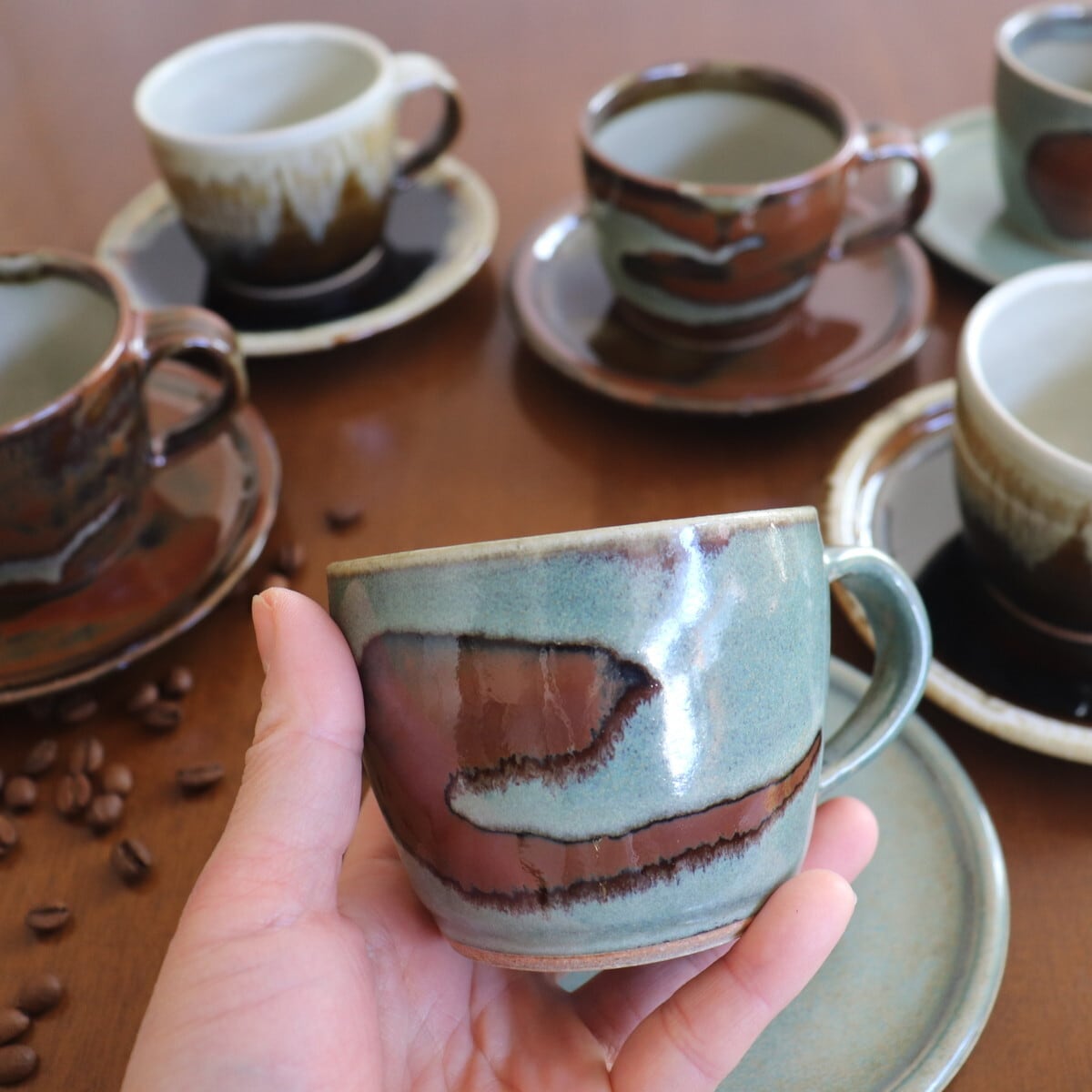 デザインは、益子焼の伝統的な柿釉(茶色)、青磁釉(青)を使った渋いデザインと、飴釉(濃茶)のベースに藁灰釉(クリーム色)を掛け合わせたクラシックなデザインの3種類。いずれも色合いがとても美しく、優雅でゴージャスな雰囲気で、極上のコーヒータイムが楽しめそうです♬