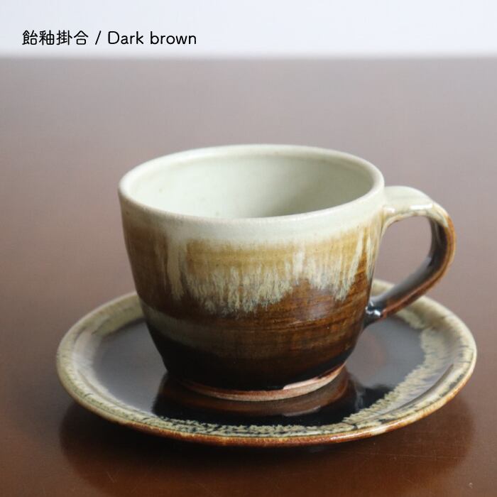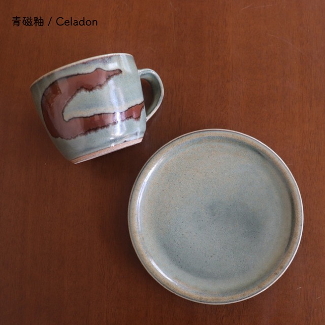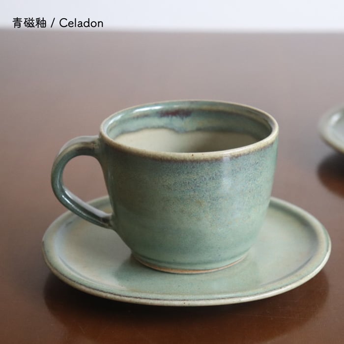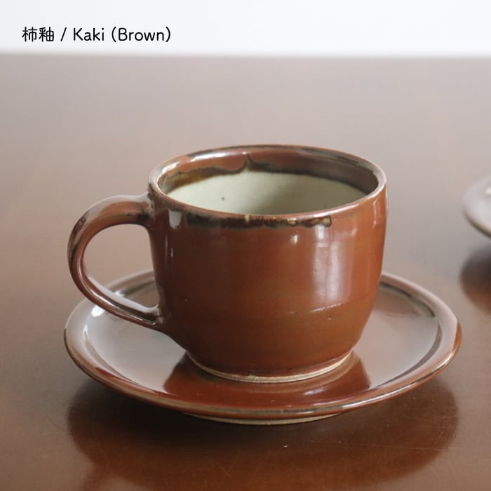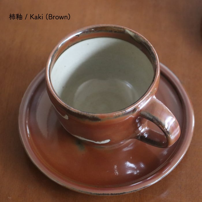 益子焼(栃木県)のカップ&ソーサー。安定感のあるゆったりめの取っ手が嬉しいカップと、お皿(5寸サイズ)としても利用できるソーサーの組み合わせ。