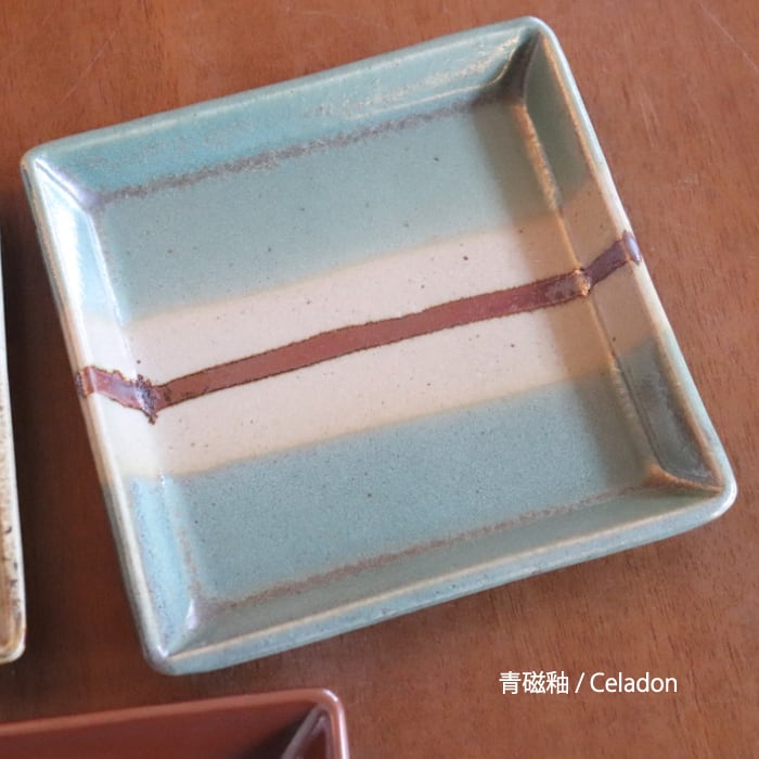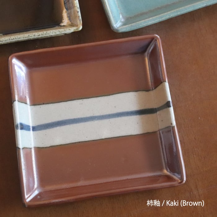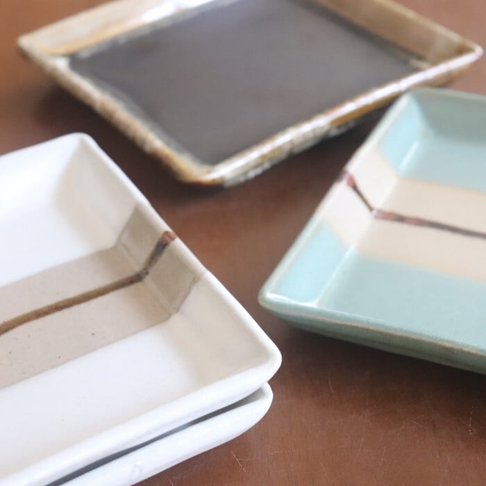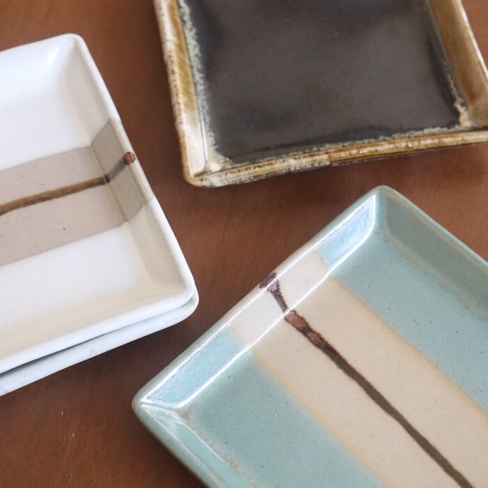 益子焼(栃木県)の四角皿。お刺身やてんぷらなどの1品料理をのせたり、大きめの取り皿としても使いやすいサイズです。益子焼の伝統的な柿釉(茶色)と青磁釉(青)、糠白釉(白)を使ったスポーティなデザイン3種と、飴釉(黒茶)と糠白釉(白)を掛け合わせたクラシックなデザインの計2種類。フラットな形状なので、洋食にも馴染みがよさそうです。