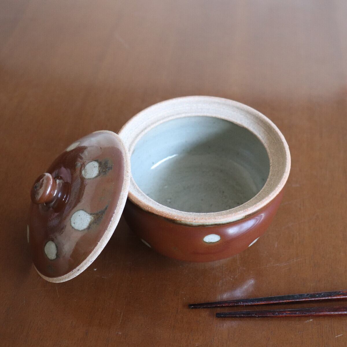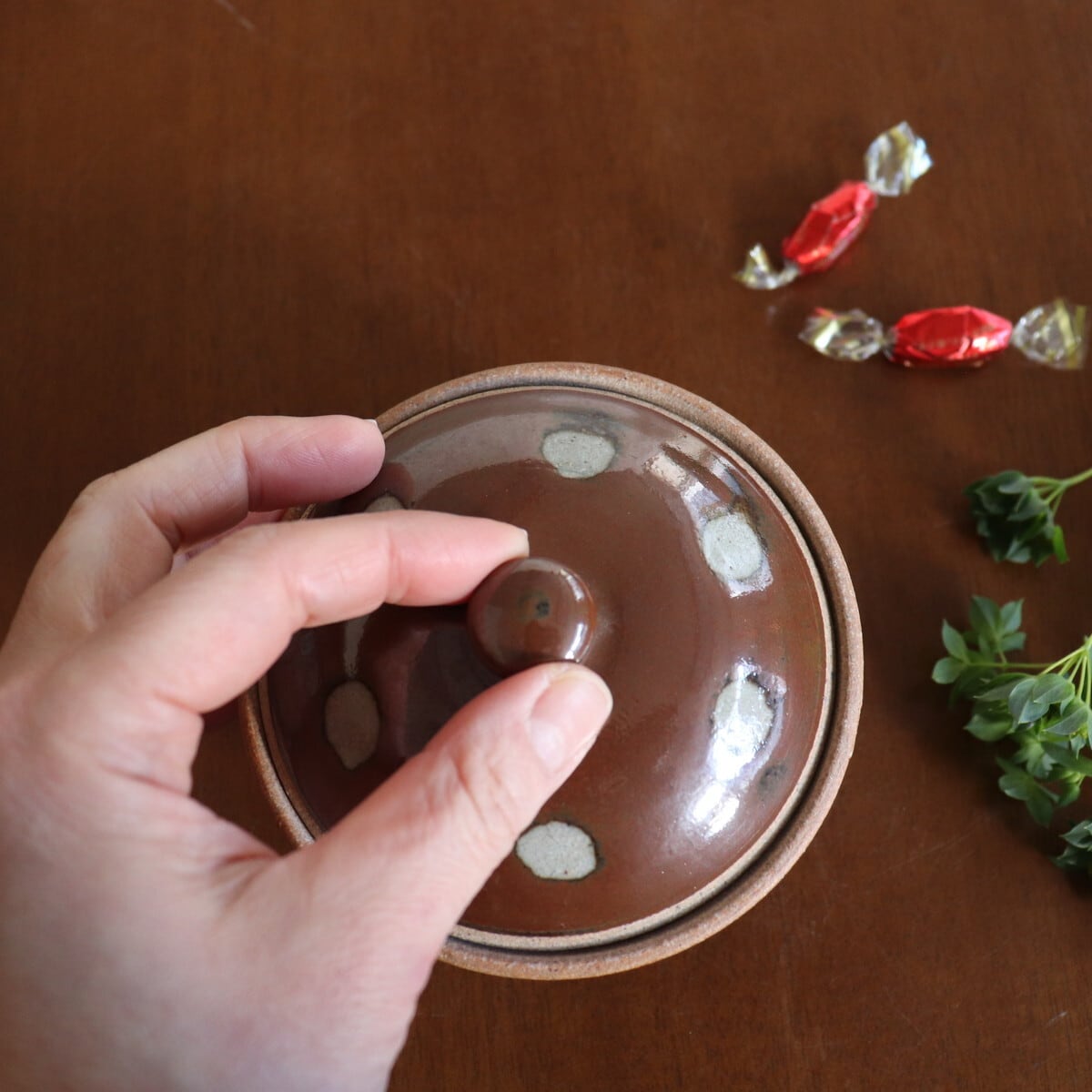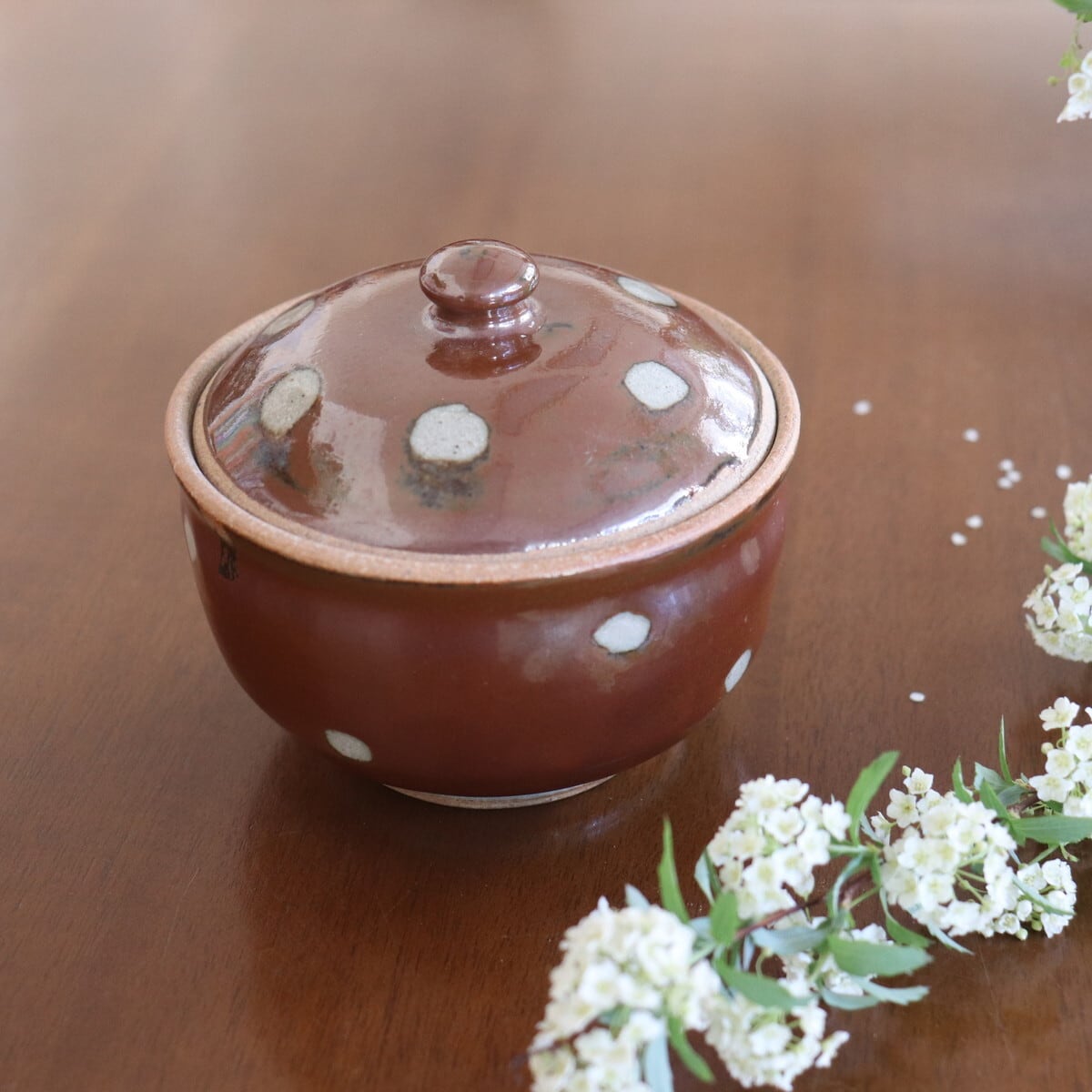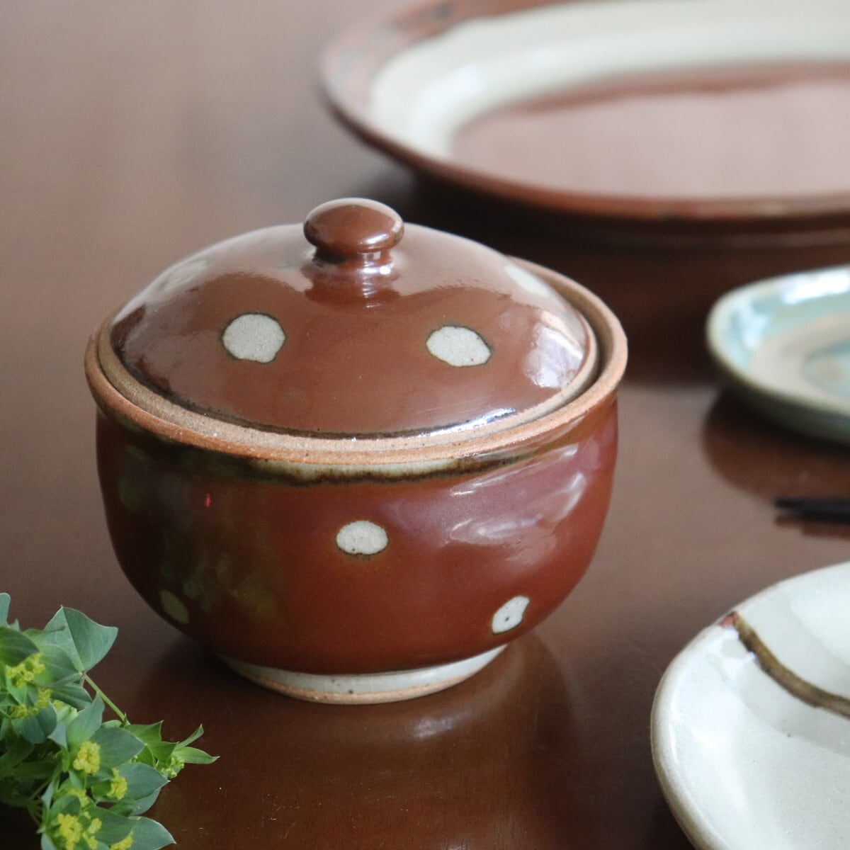益子焼(栃木県)の蓋つきの器。やや大きめの片手サイズで、普通盛りのご飯茶椀くらいのサイズ感です。梅干しやらっきょう、佃煮などの常備菜入れとしてはもちろん、煮物などのお料理を盛り付けても絵になりそうです。益子焼の特徴とも言える柿釉(茶)を生かしたシンプルでかわいらしいデザインは、主張しすぎず、和やかに食卓を彩ってくれそうです。