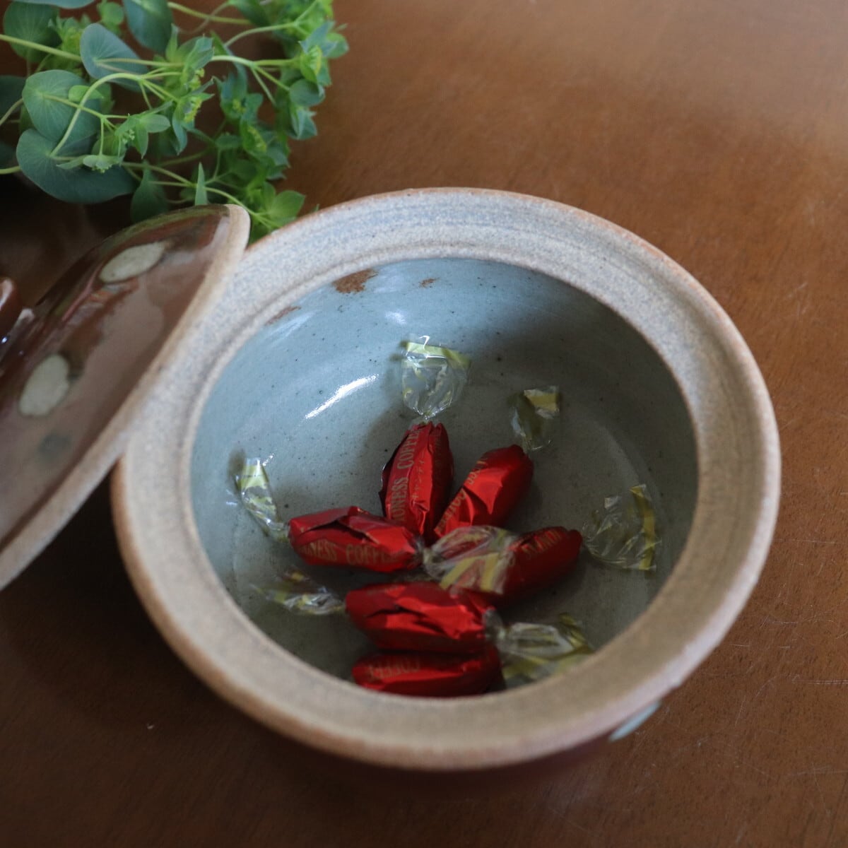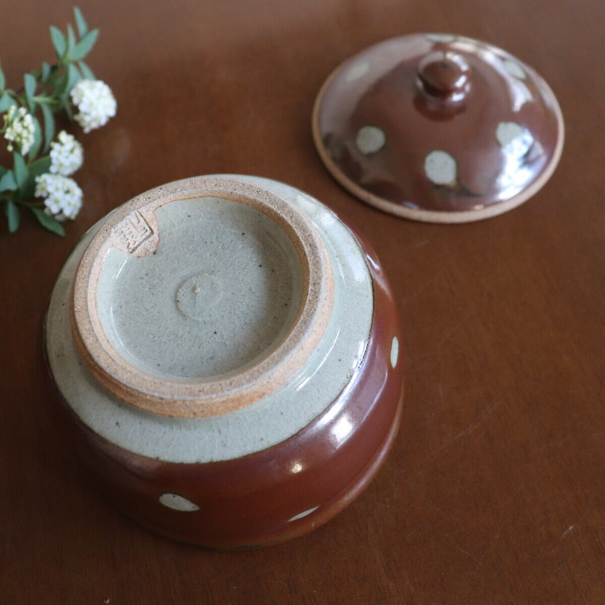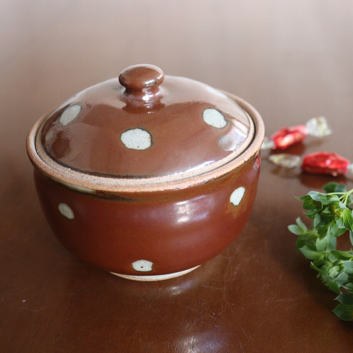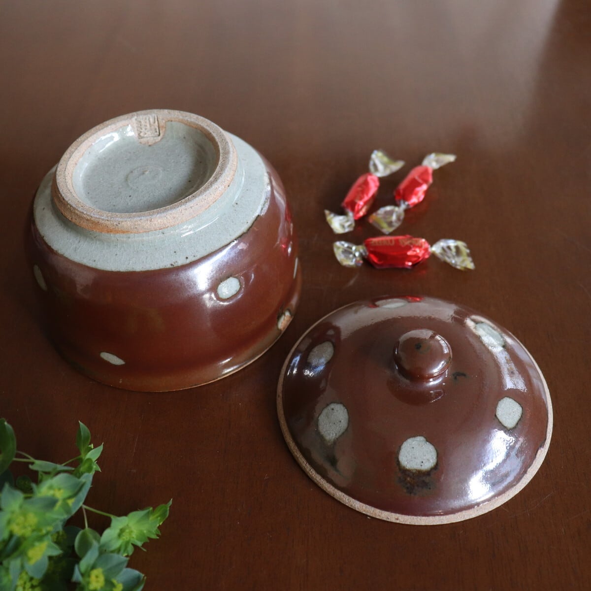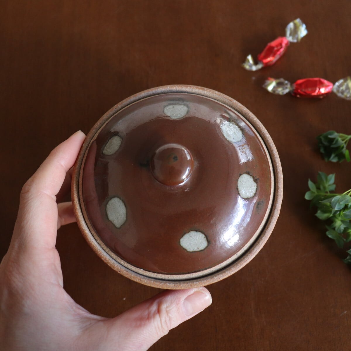益子焼(栃木県)の蓋つきの器。やや大きめの片手サイズで、普通盛りのご飯茶椀くらいのサイズ感です。梅干しやらっきょう、佃煮などの常備菜入れとしてはもちろん、煮物などのお料理を盛り付けても絵になりそうです。益子焼の特徴とも言える柿釉(茶)を生かしたシンプルでかわいらしいデザインは、主張しすぎず、和やかに食卓を彩ってくれそうです。