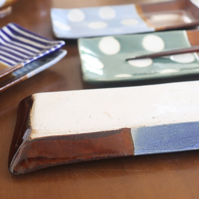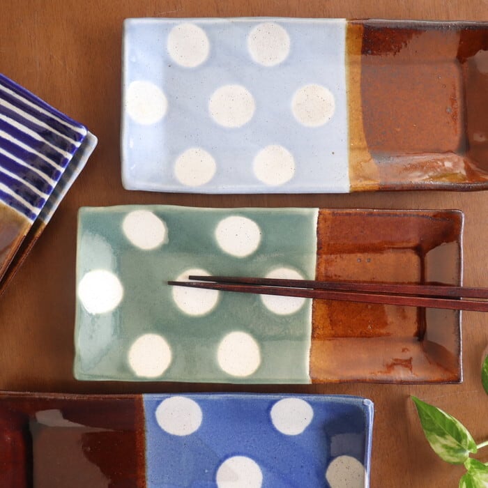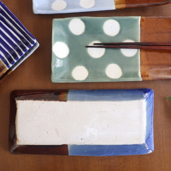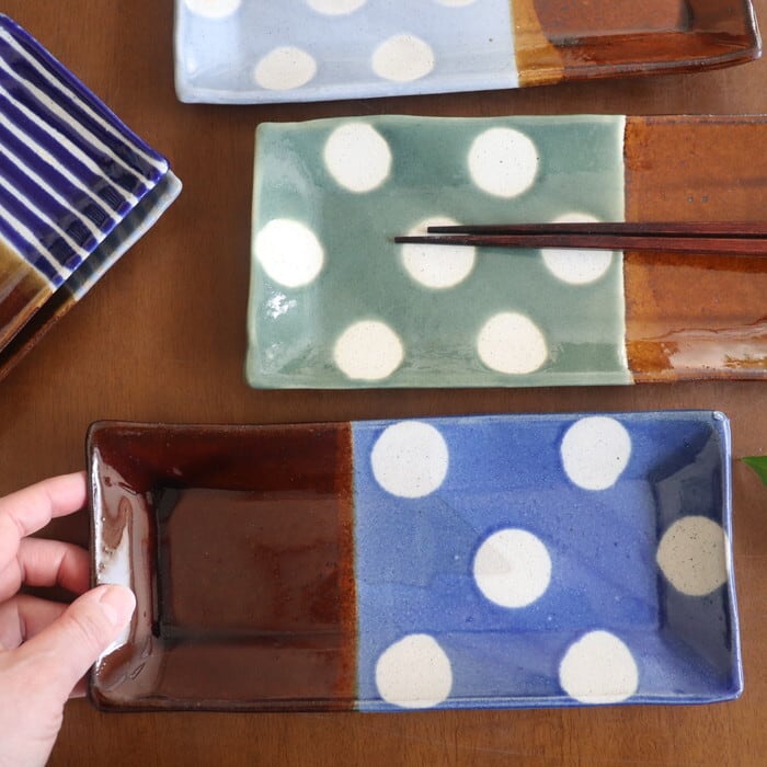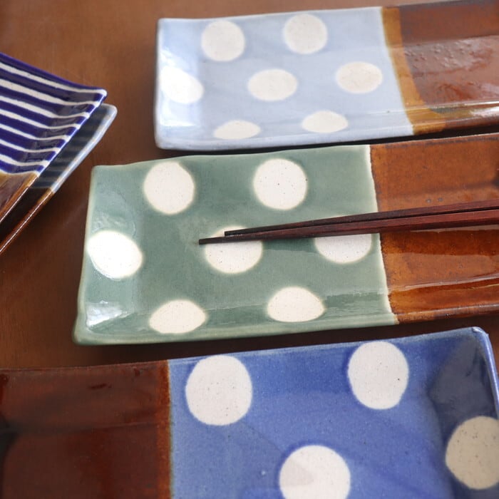 飴釉(茶)をベースに、青や水色などのポップな色使いで、ストライプやドットを描いた大胆なデザイン。食卓にあるだけで、女子力もテンションもアップしそう♡