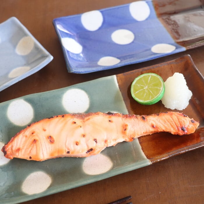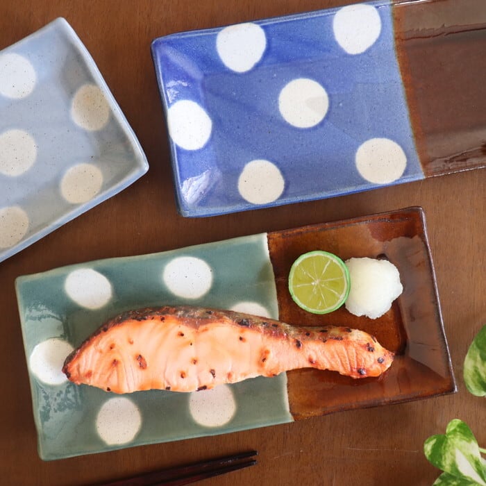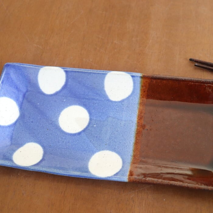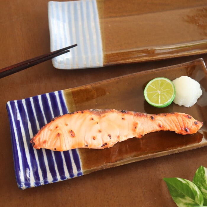 キュートなデザインの益子焼(栃木県)の長角皿。形的には焼魚をのせたくなりますが、少しだけ深さがあるので立派なサイズの焼き魚には少し窮屈なサイズ。普通サイズの鮭やアジ、シシャモなどの細長いお魚にはぴったりです。