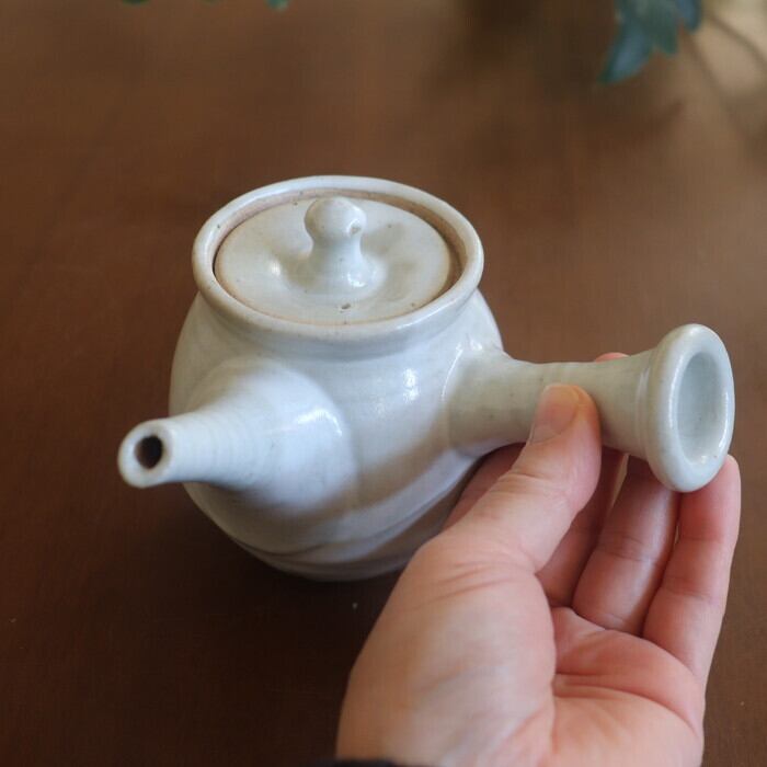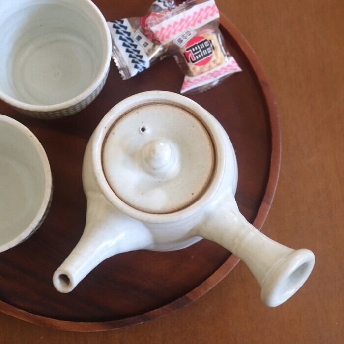 糠白(ぬかしろ)釉の味わい深い色合いが素朴な益子焼(栃木県)の急須。握りやすい取手とサイズ感で、どこか懐かしい昔ながらのスタイルです。日本茶はもちろん、そば茶や黒豆茶といった雑穀系のお茶にも良く似合いそうです。