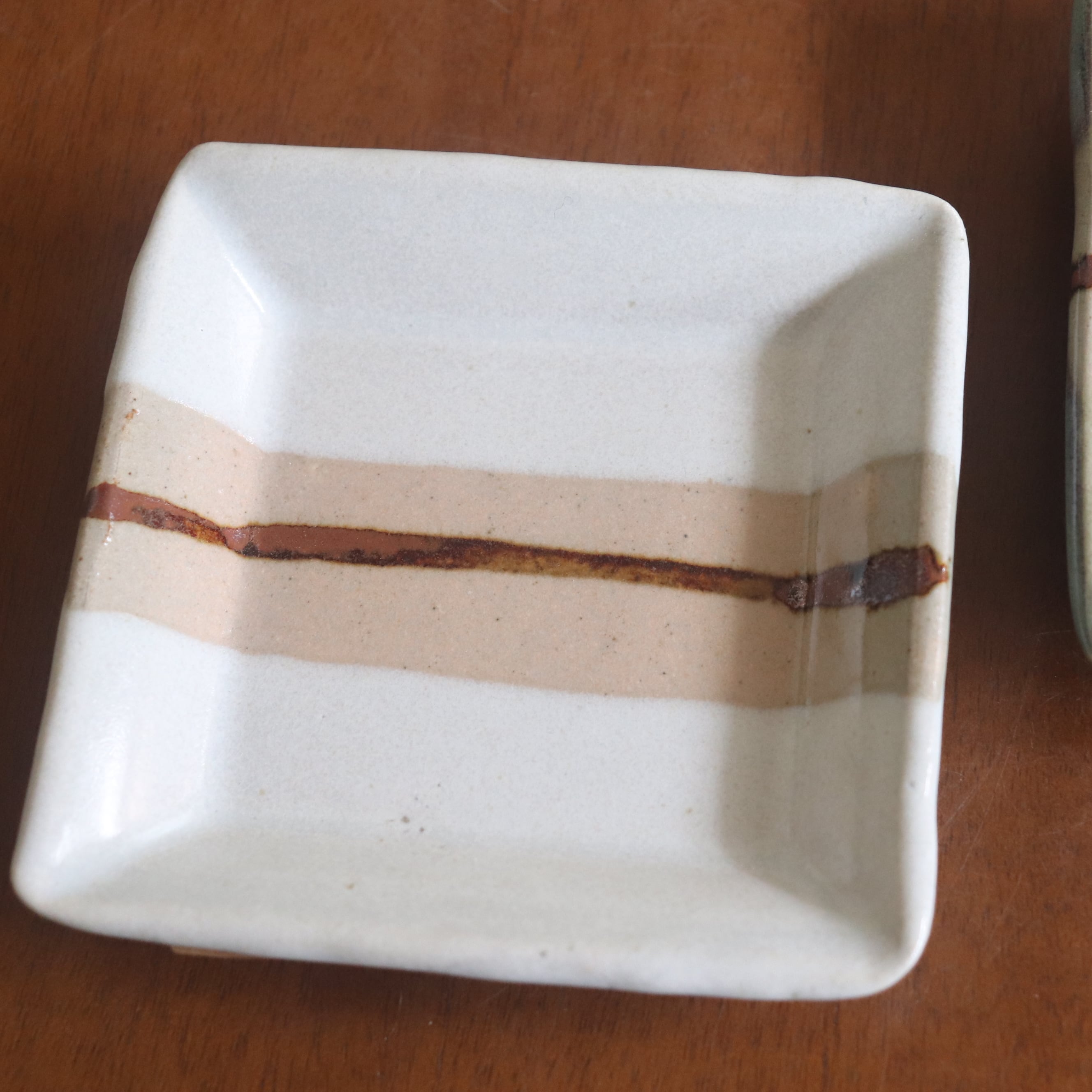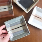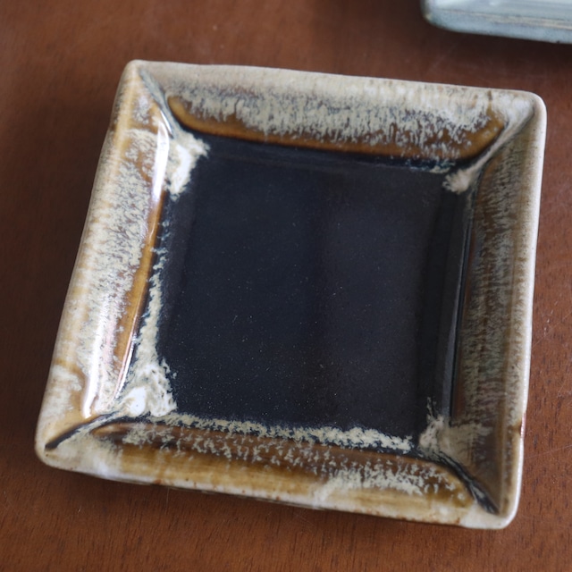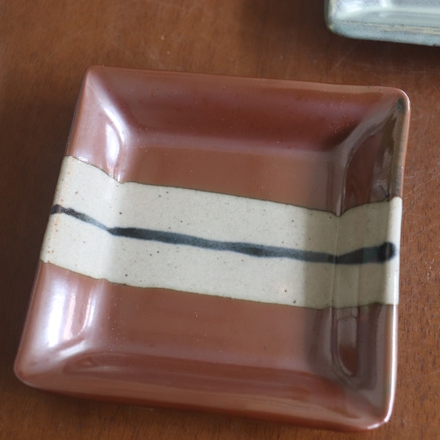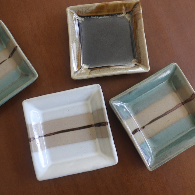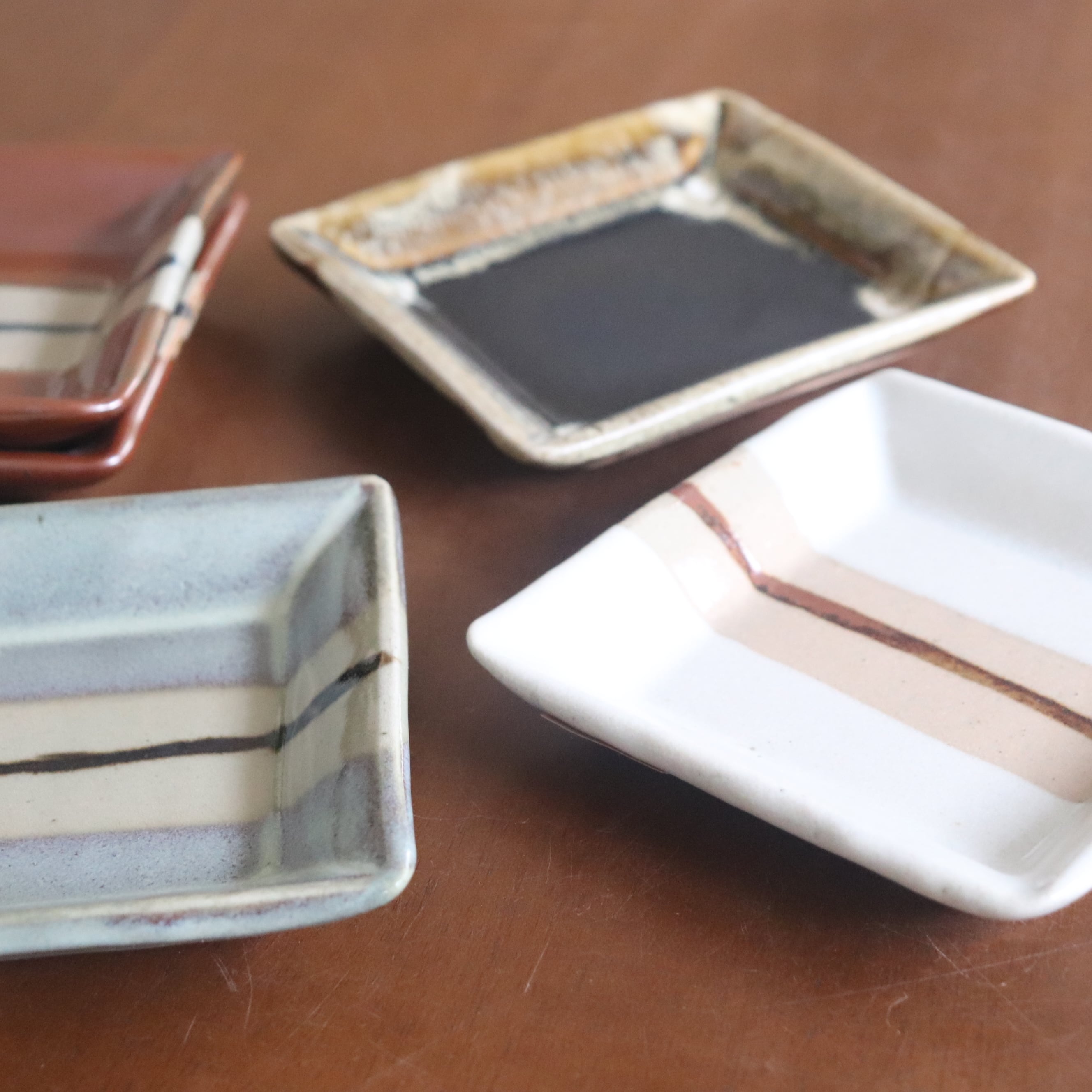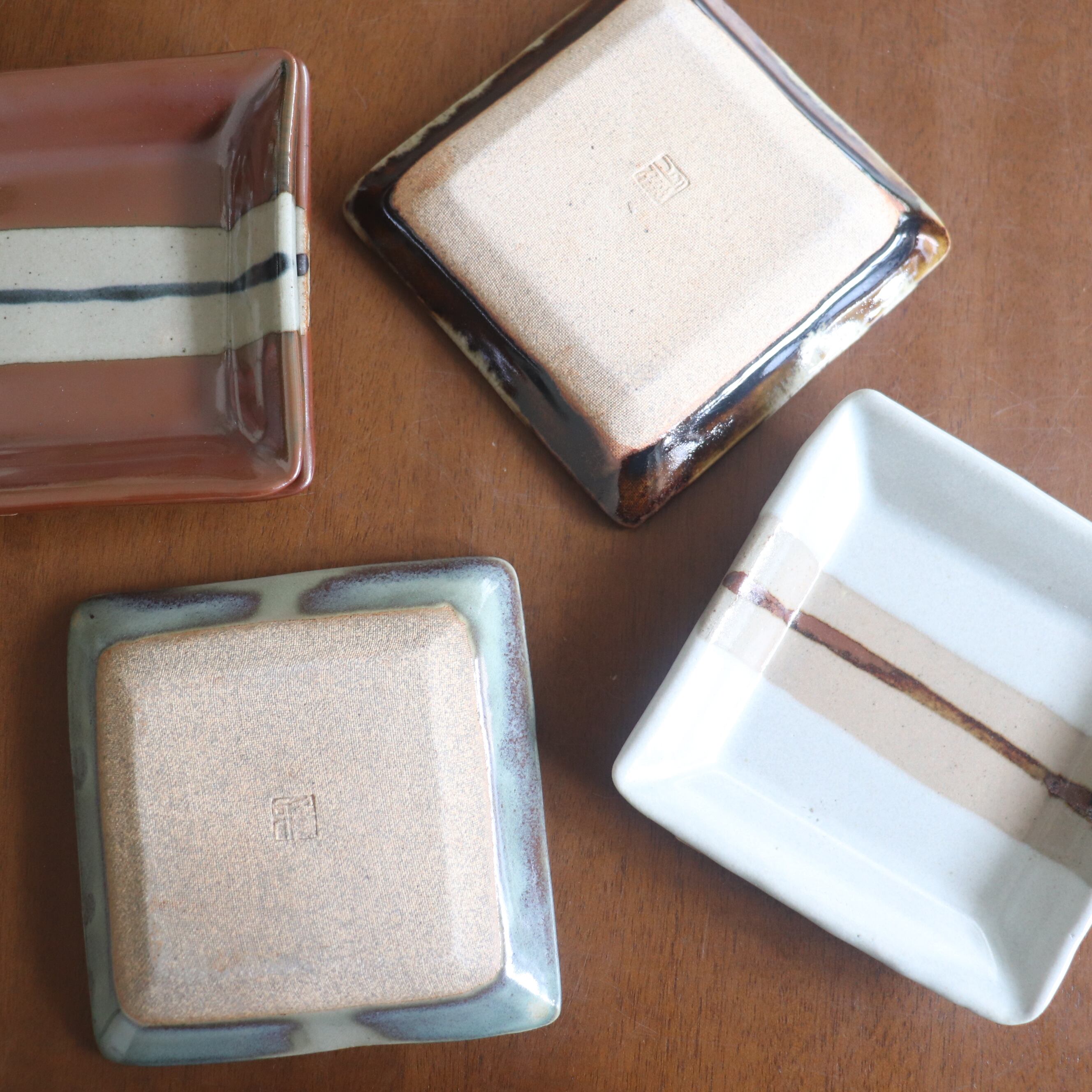 益子焼(栃木県)の四角皿。取り皿や菓子皿にちょうど良いサイズです。益子焼の伝統的な柿釉(茶色)、青磁釉(青)を使ったスポーティなデザインと、飴釉(濃茶)のベースに藁灰釉(クリーム色)を掛け合わせたクラシックなデザインの3種類。