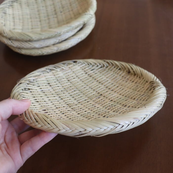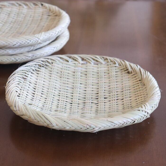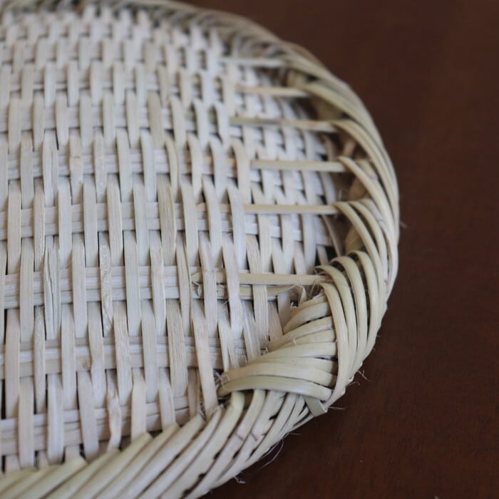 すず竹細工の有名な産地として知られる、岩手県の鳥越地区(二戸郡一戸町)。当地に自生する貴重なすず竹を材料に、底面は「ござ目編み」、縁部分は「矢筈(やはず)巻き」という仕上げ方で丈夫に巻かれています。